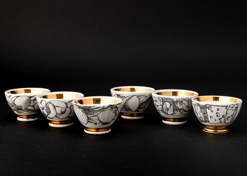 Lotto formato da sei ciotoline per antipasti in terraglia con decoro serigrafato e fasce oro.