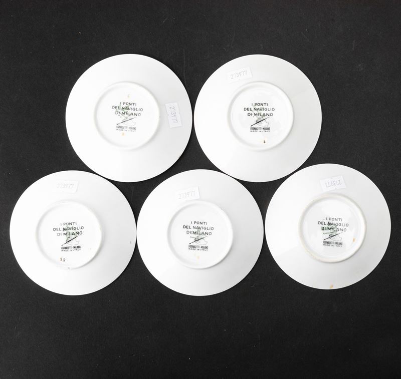 Lotto composto da cinque piattini in porcellana serie I Ponti del Naviglio di Milano con decoro serigrafato e bordo oro.