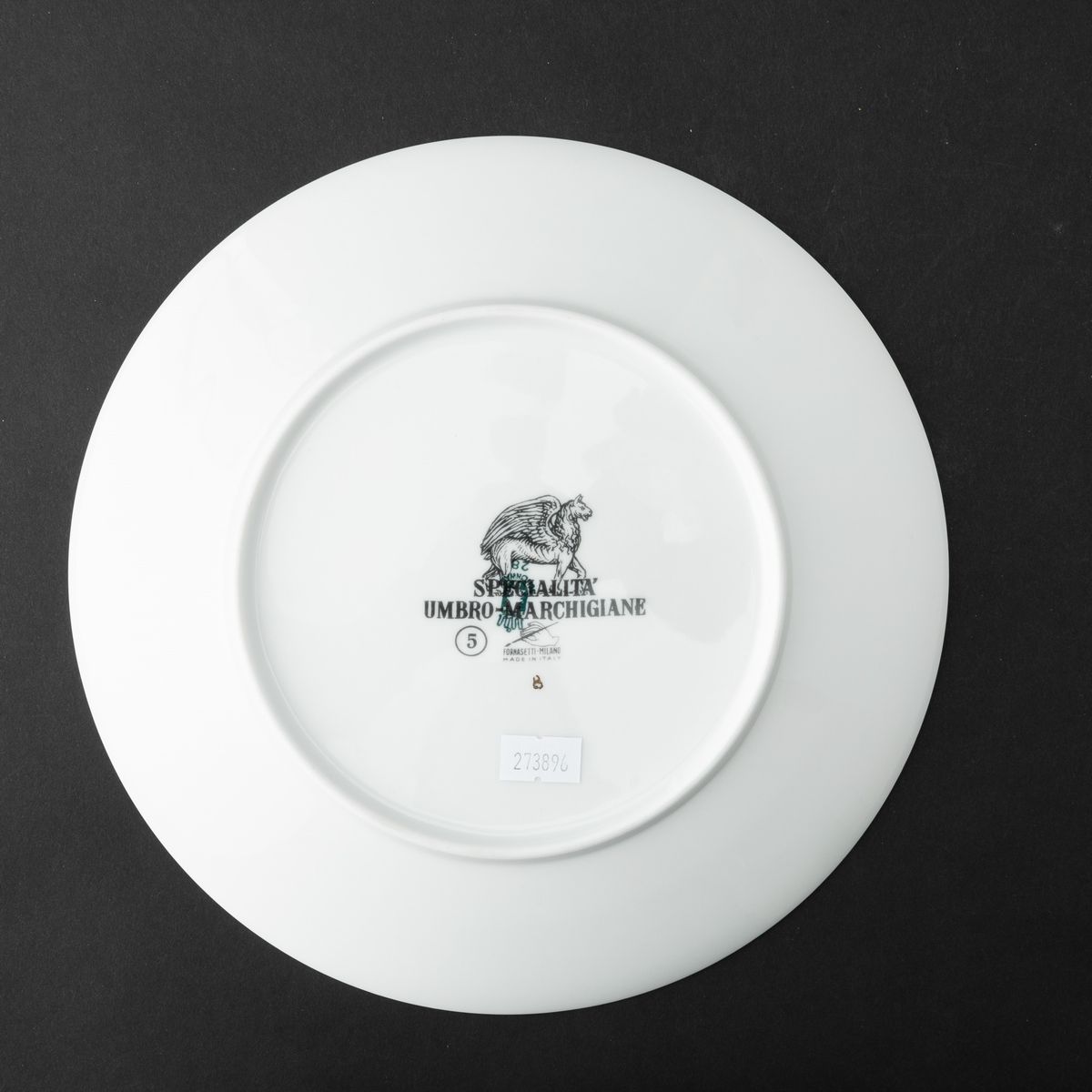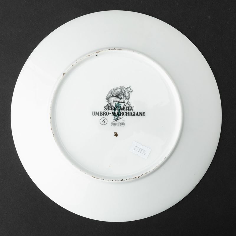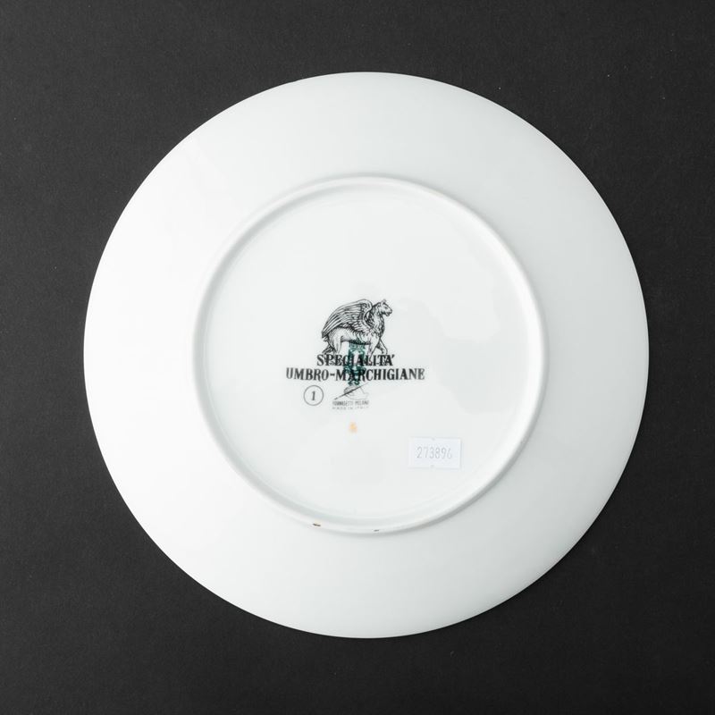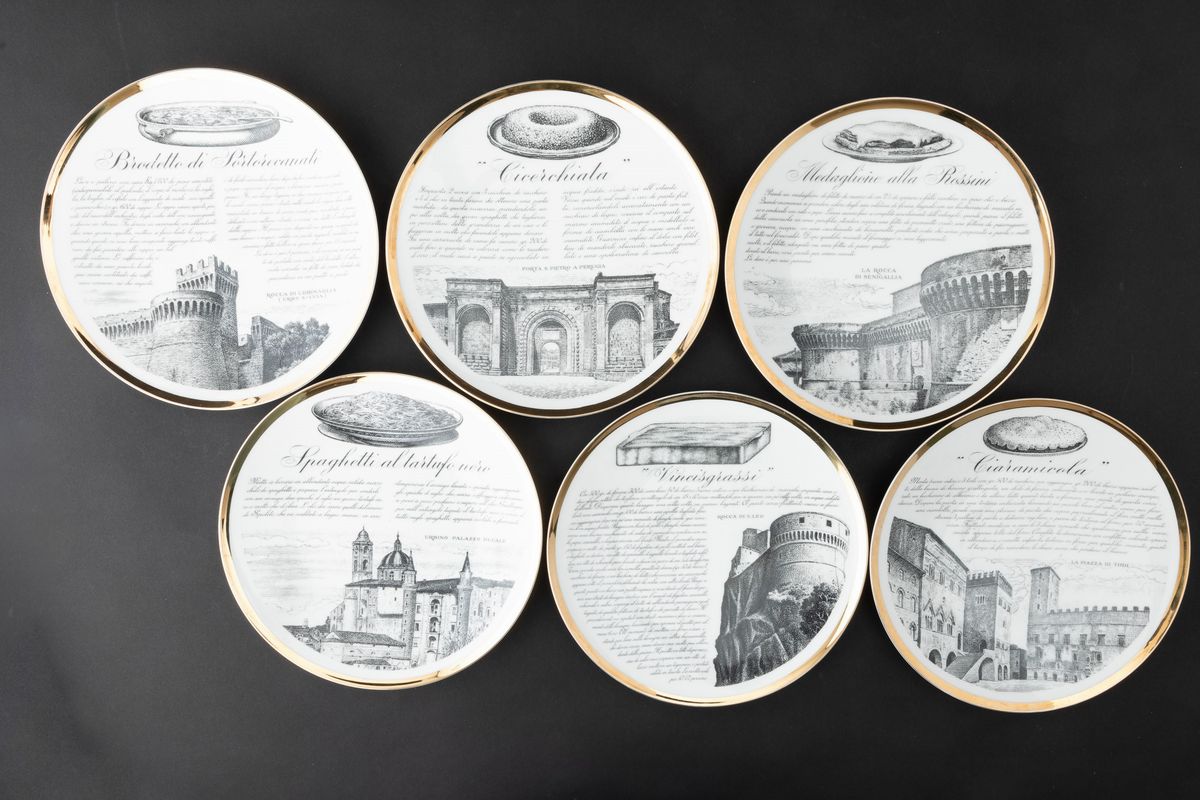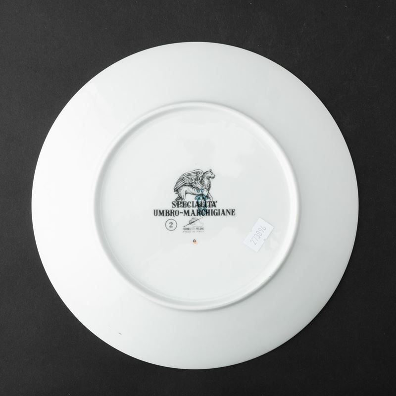 Lotto formato da sei piatti serie Specialità Umbro Marchigiane in porcellana con decoro serigrafato e bordo oro.