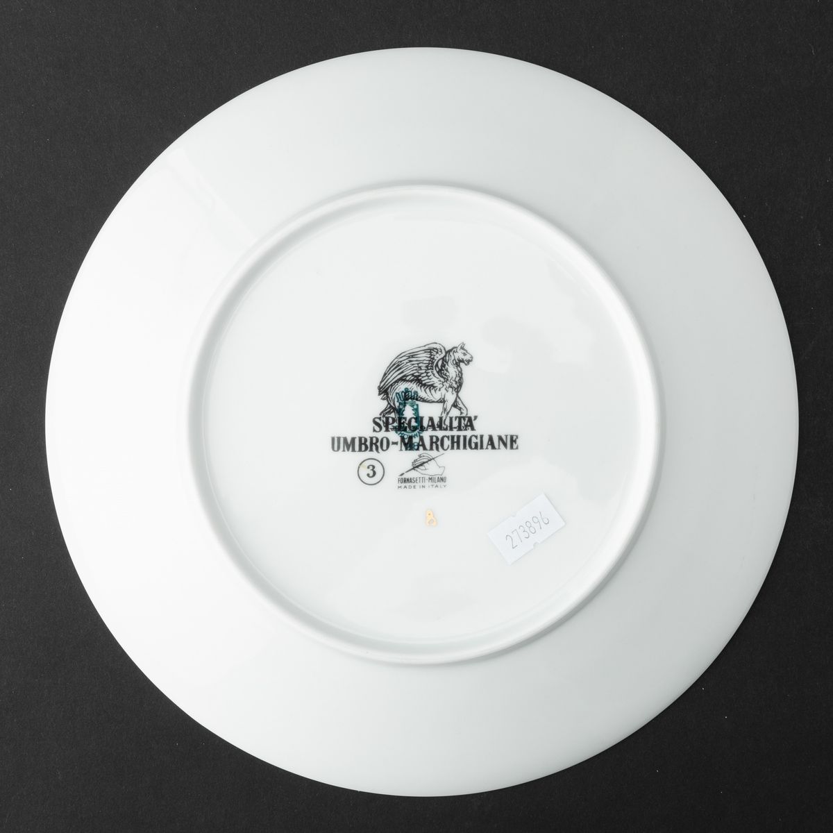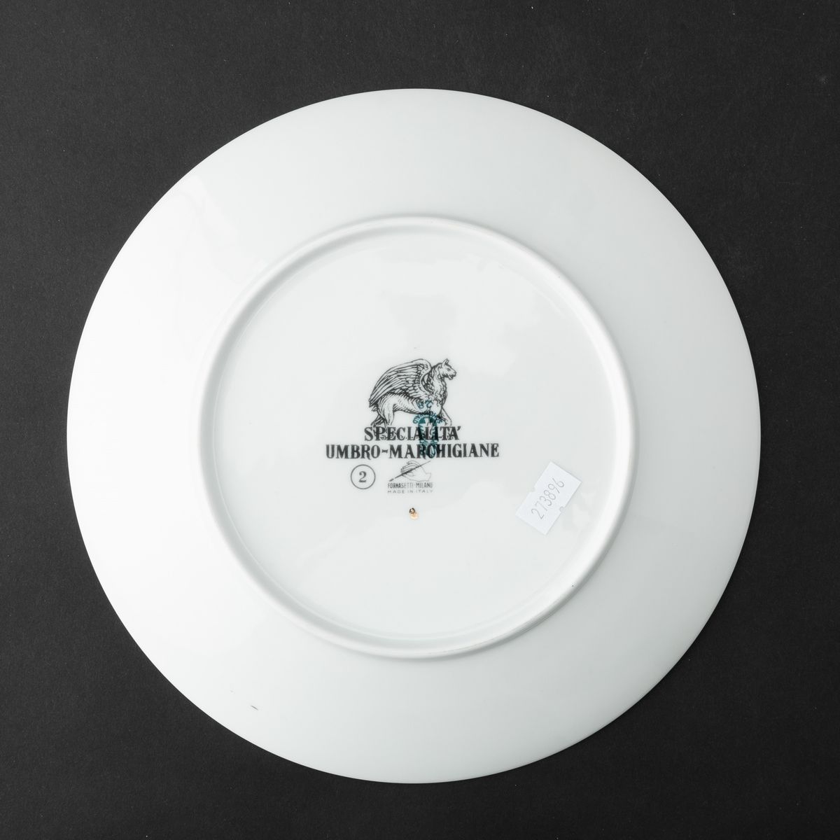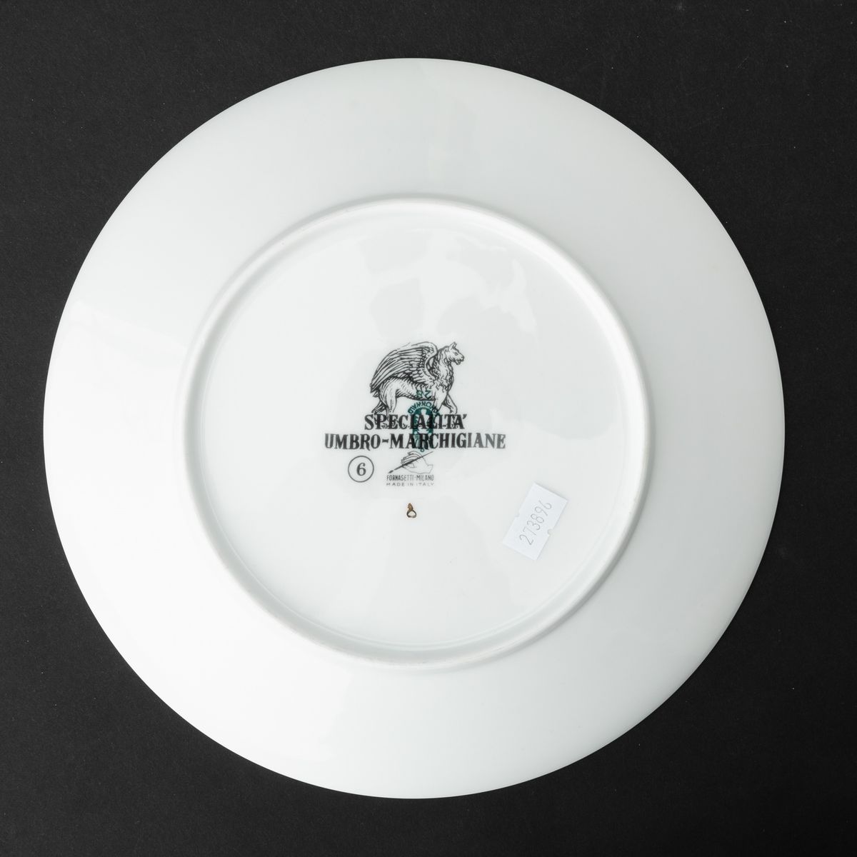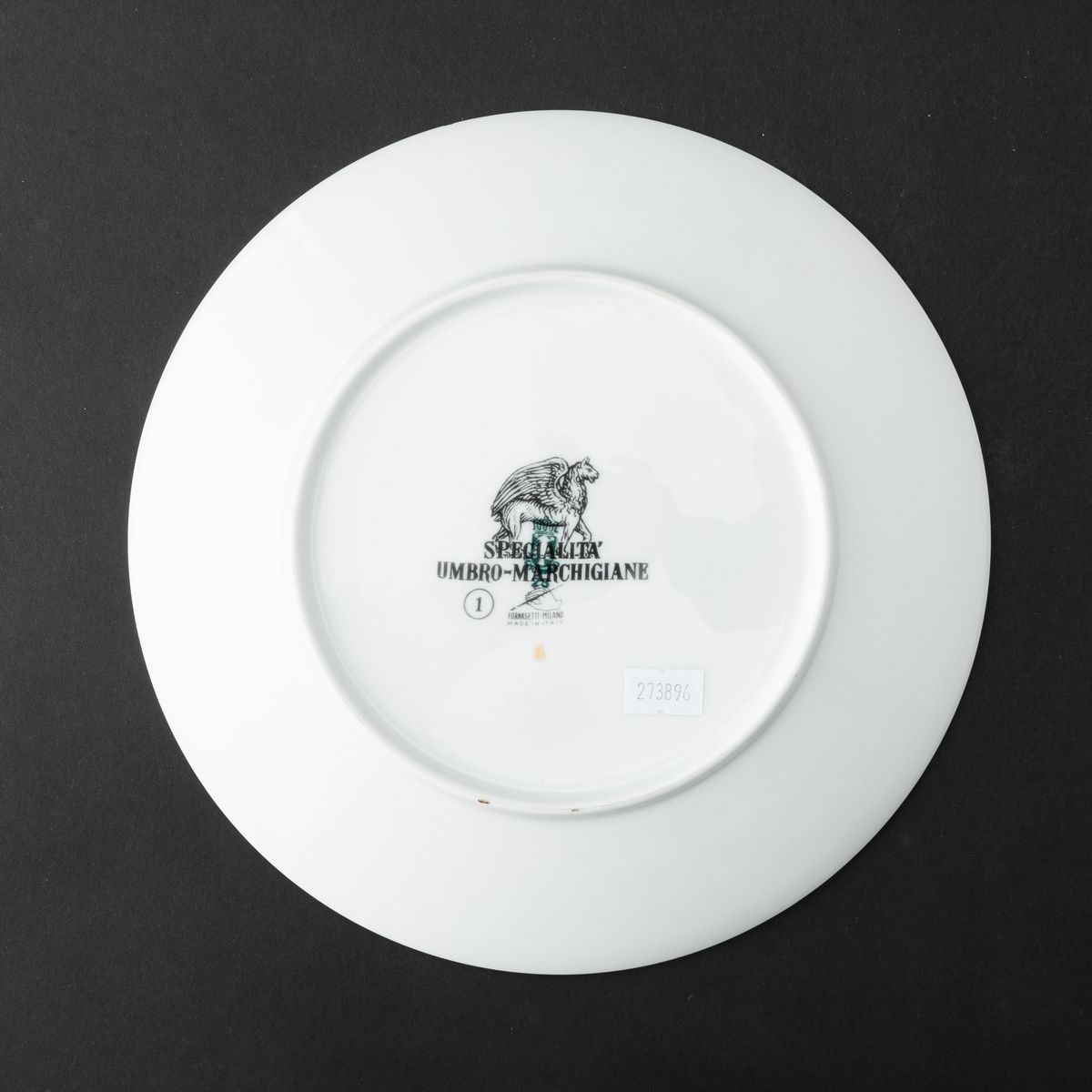 Lotto formato da sei piatti serie Specialità Umbro Marchigiane in porcellana con decoro serigrafato e bordo oro.