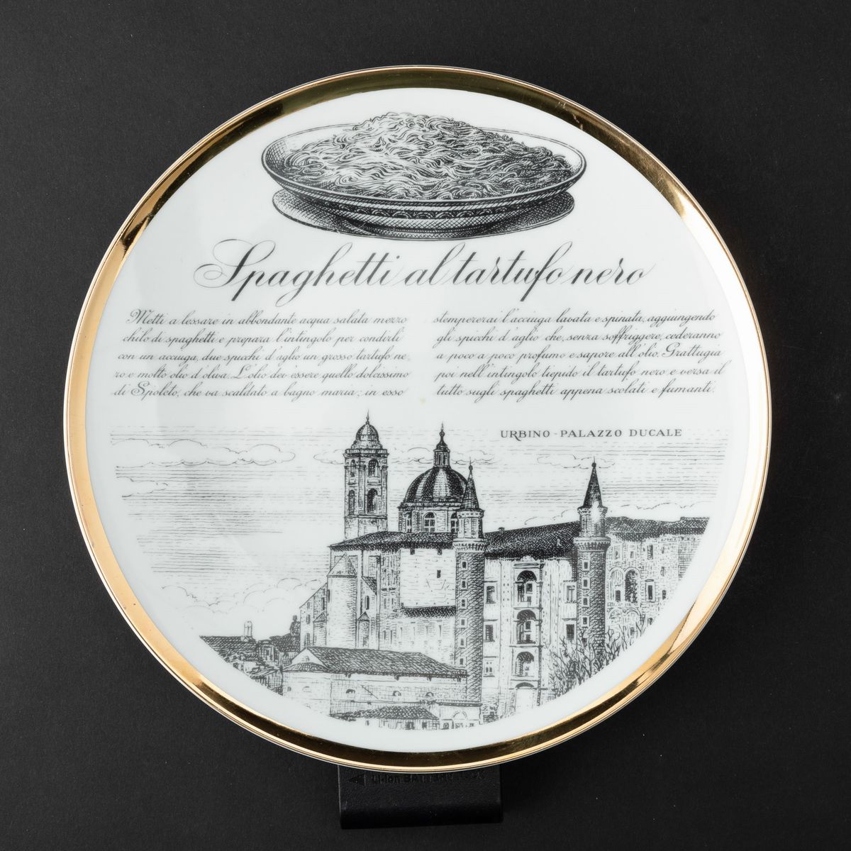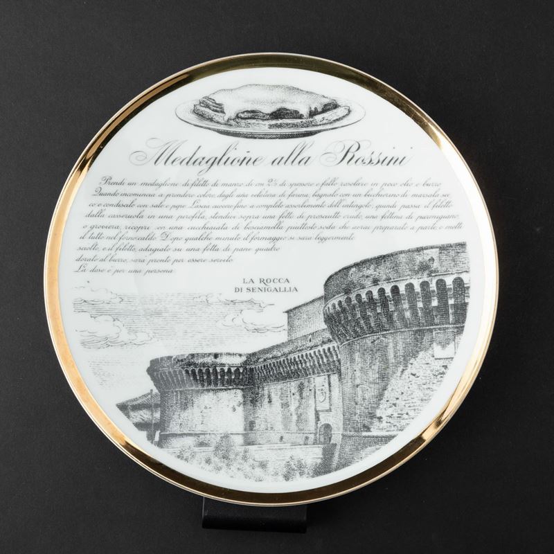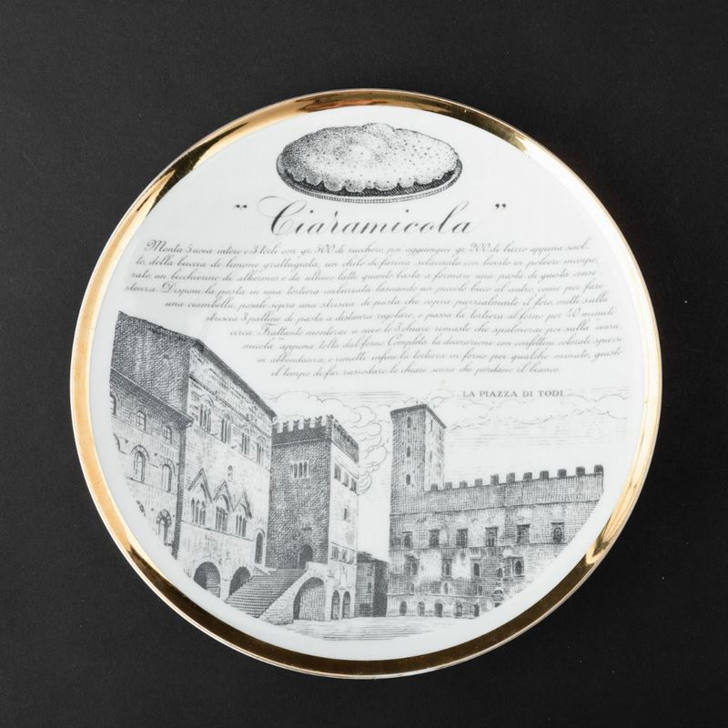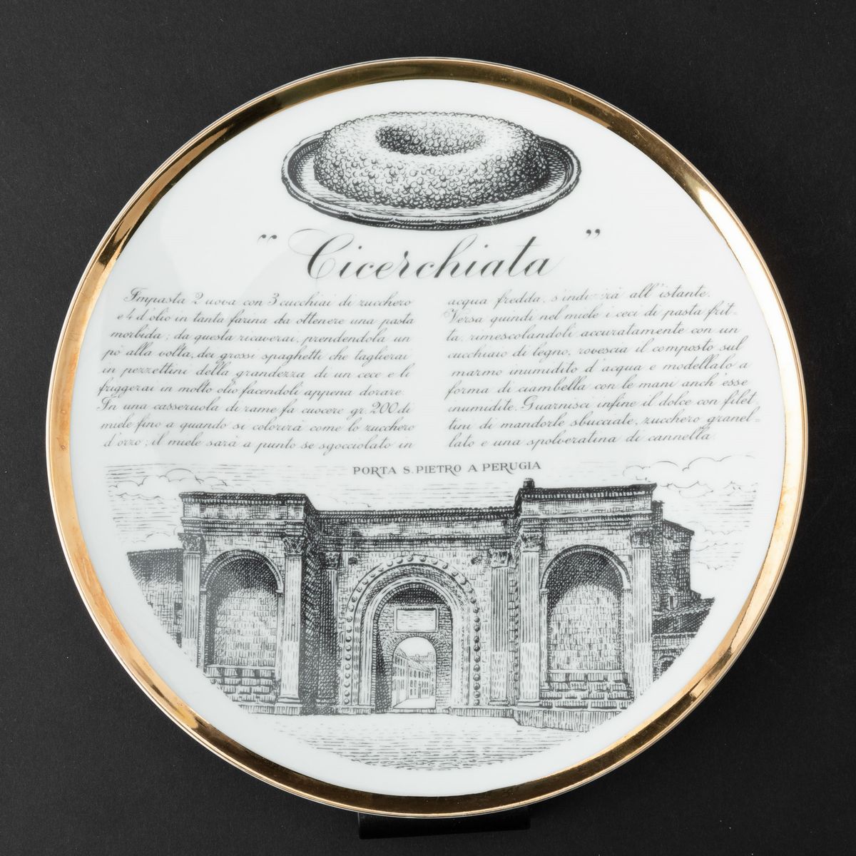 Lotto formato da sei piatti serie Specialità Umbro Marchigiane in porcellana con decoro serigrafato e bordo oro.