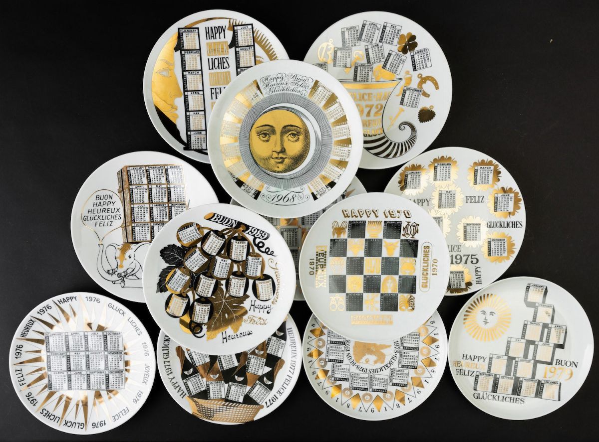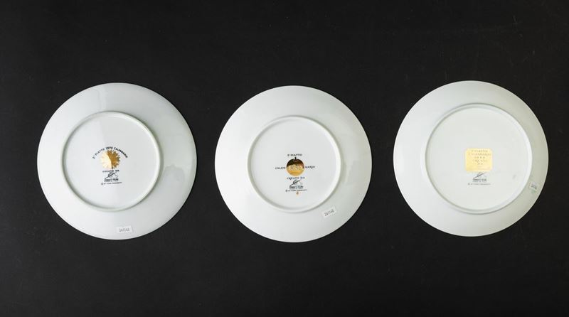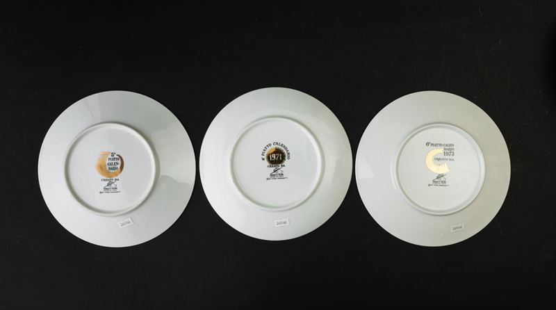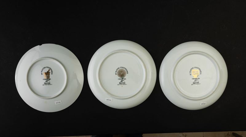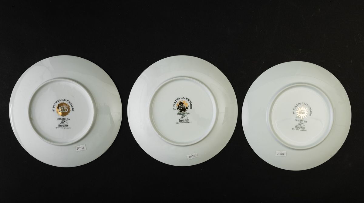 Lotto formato da dodici piatti serie Calendario dal 1968 al 1979 in porcellana con decoro serigrafato e oro.