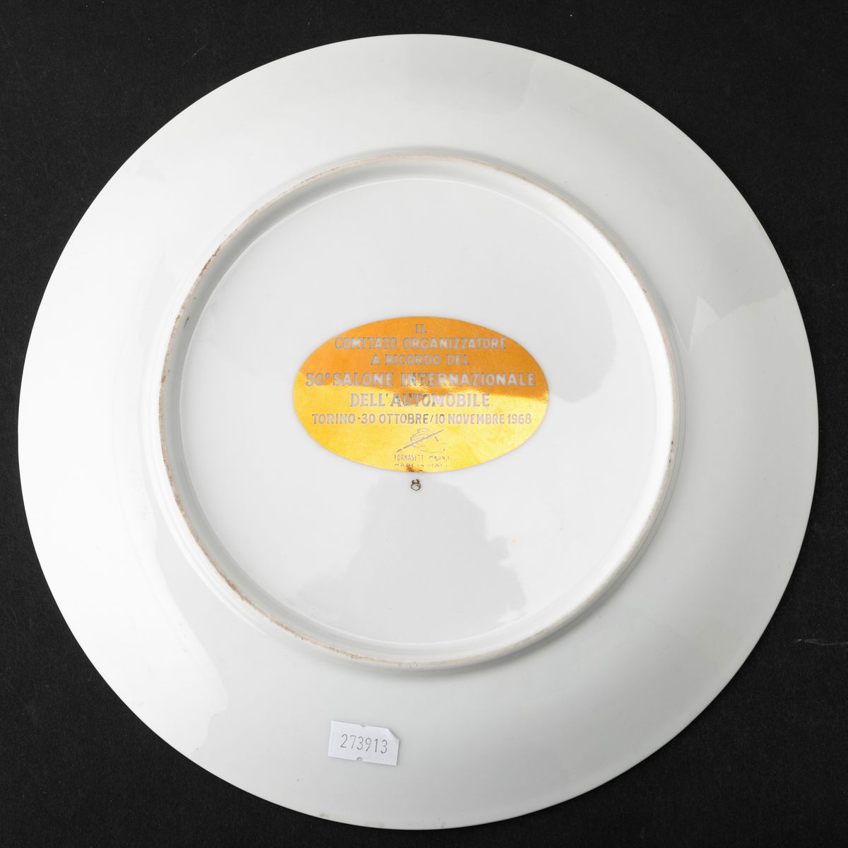 Piatto in porcellana con decoro serigrafato e oro. Realizzato per il 50° Salone Internazionale dell’Automobile.