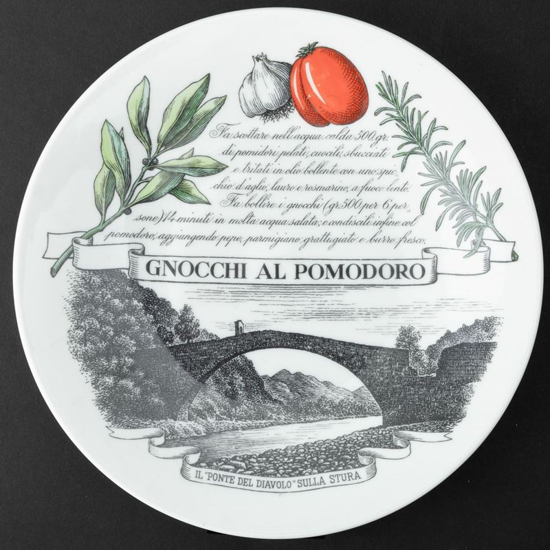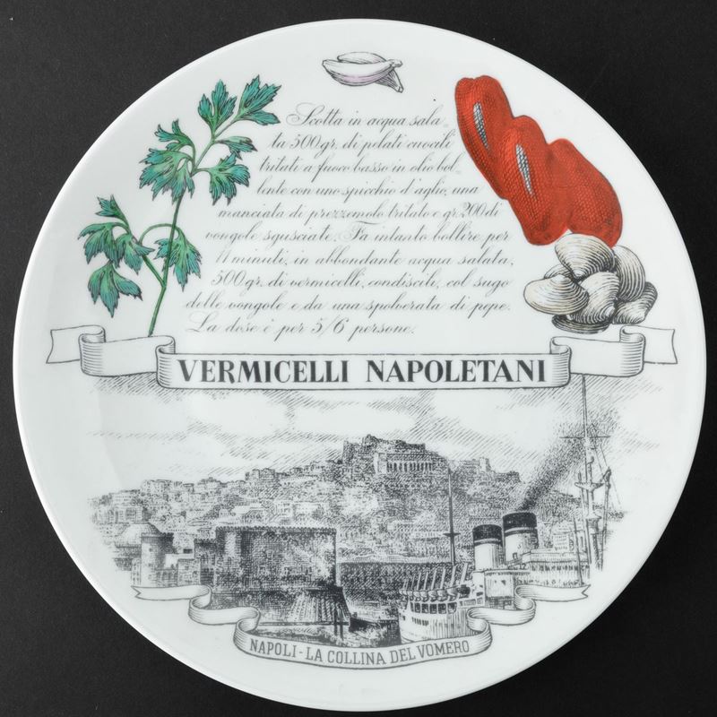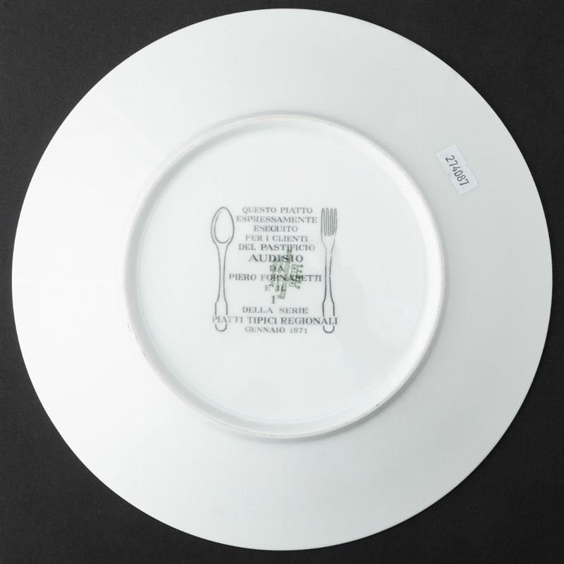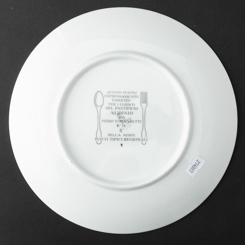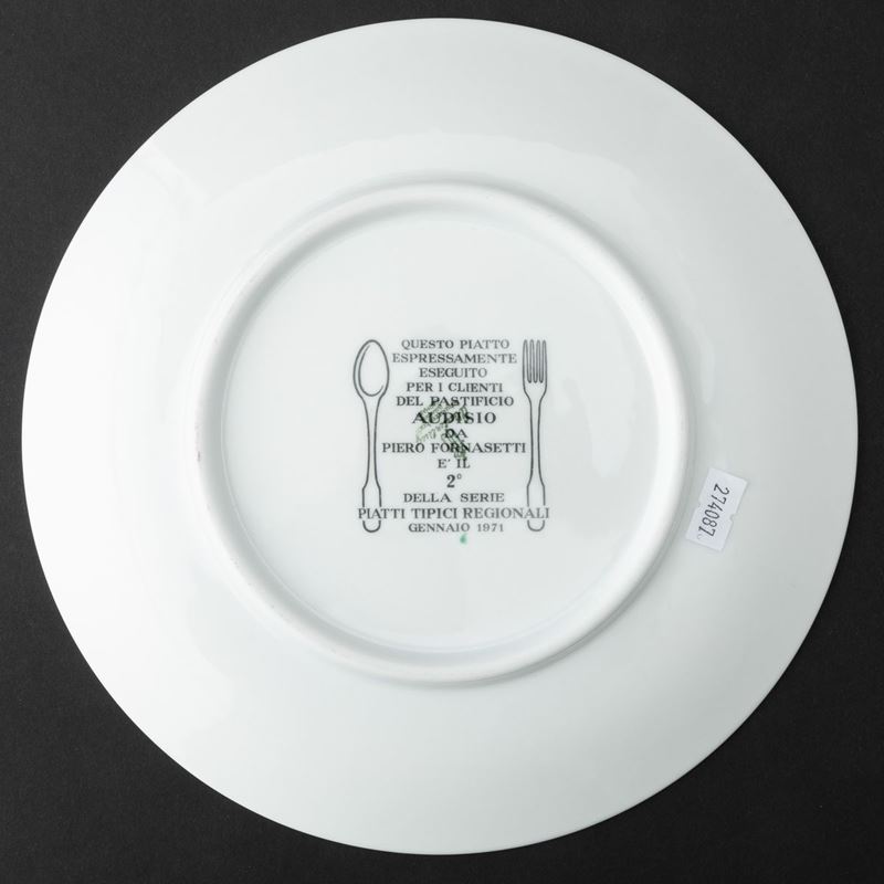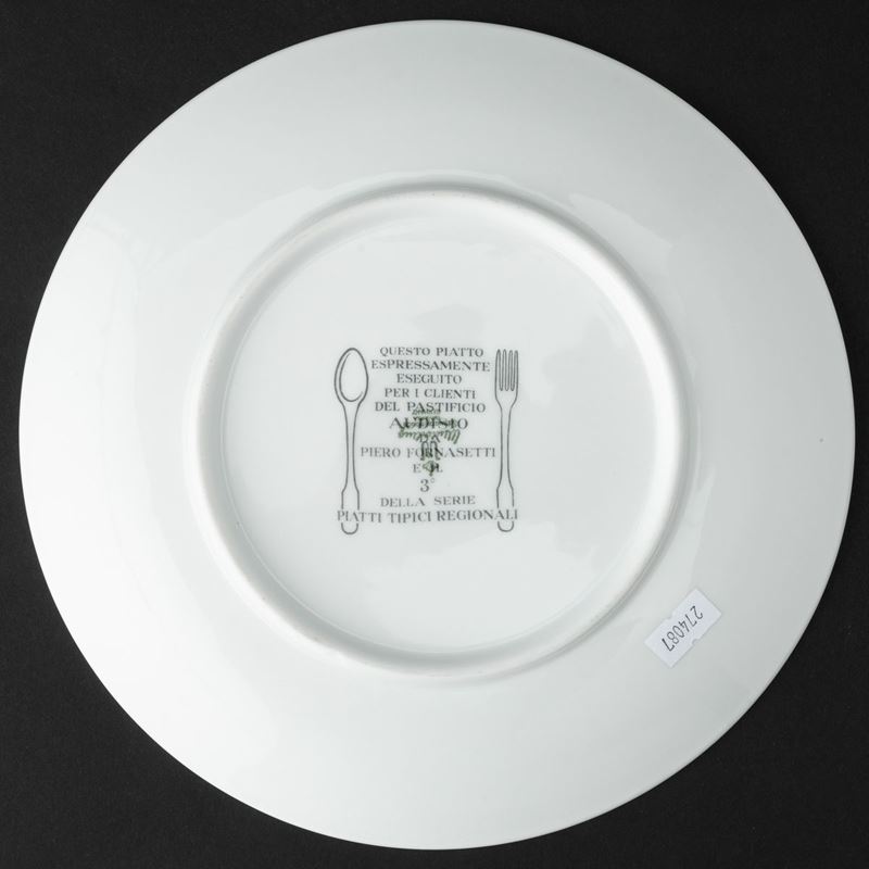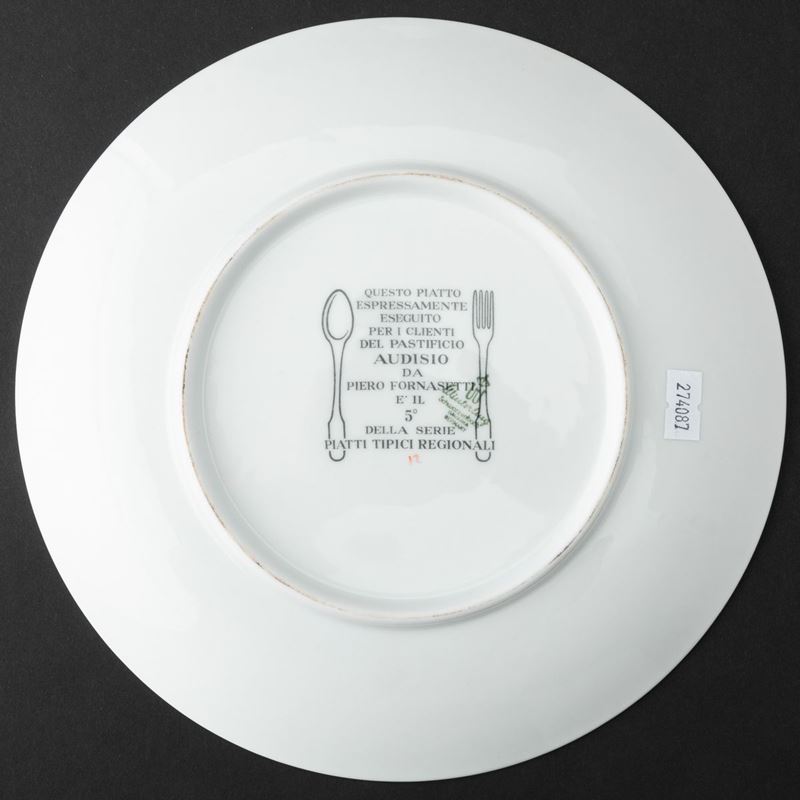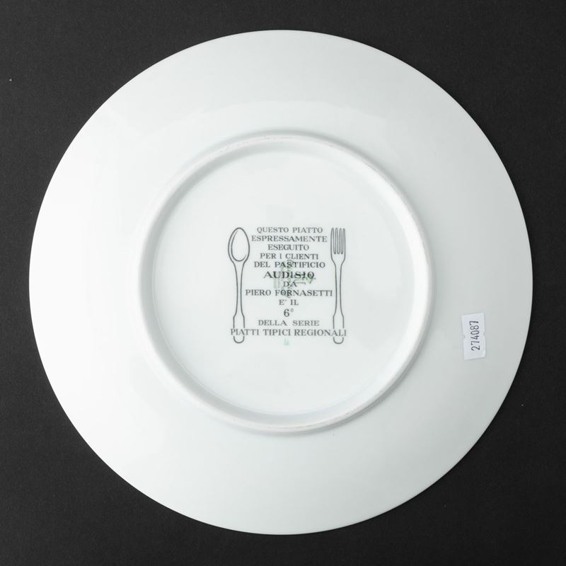 Lotto formato da sei piatti serie Piatti Tipici Regionali in porcellana con decoro serigrafato policromo. Realizzati per i clienti del Pastificio Audisio.