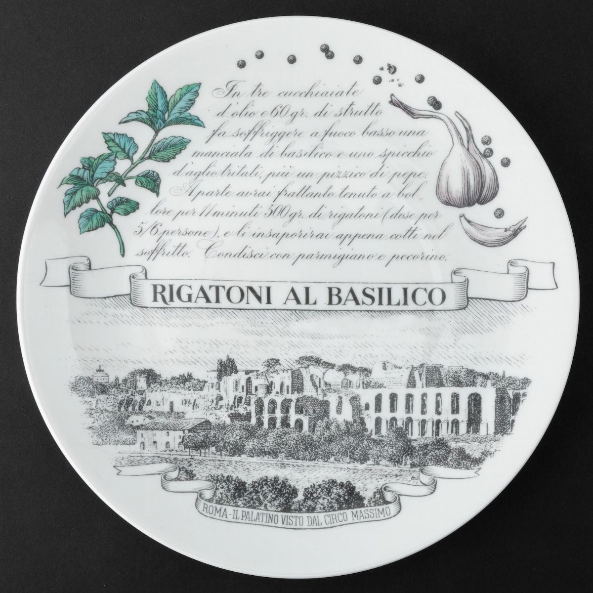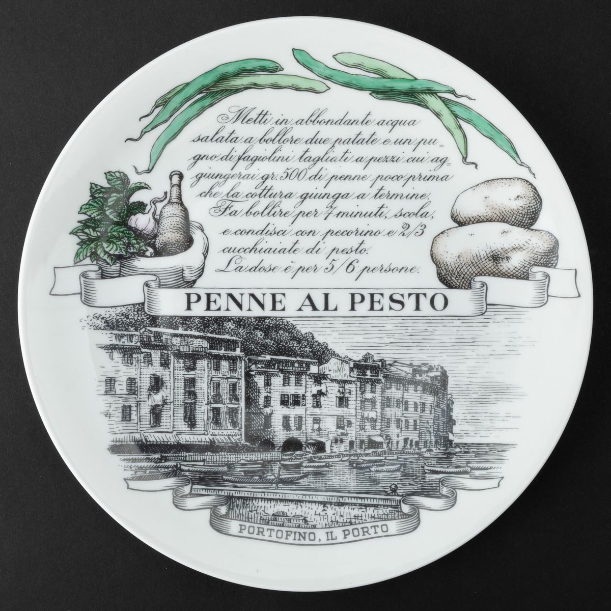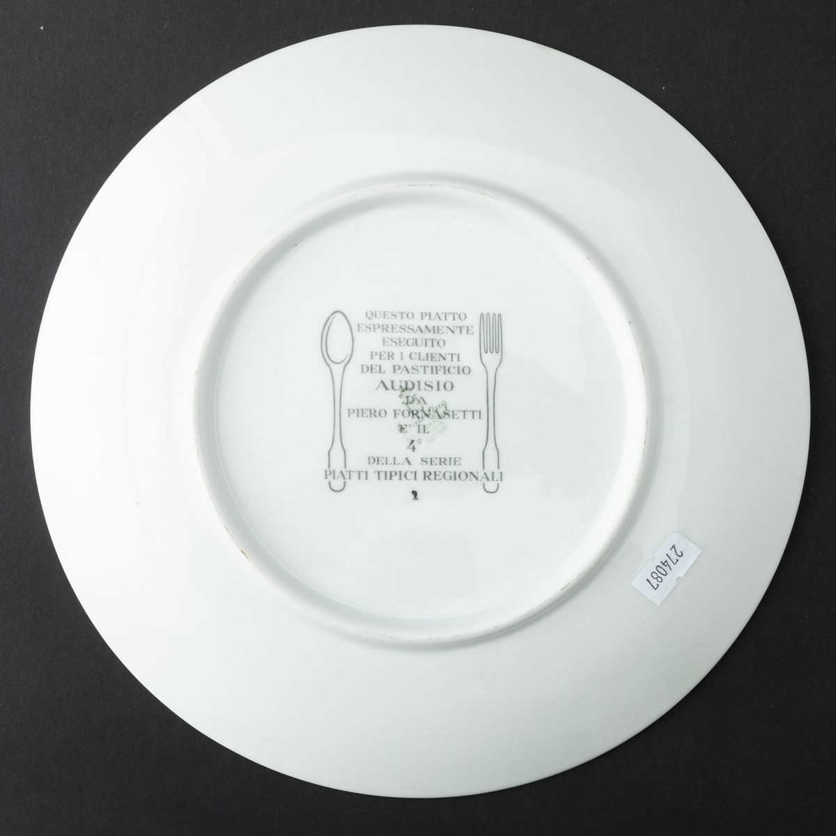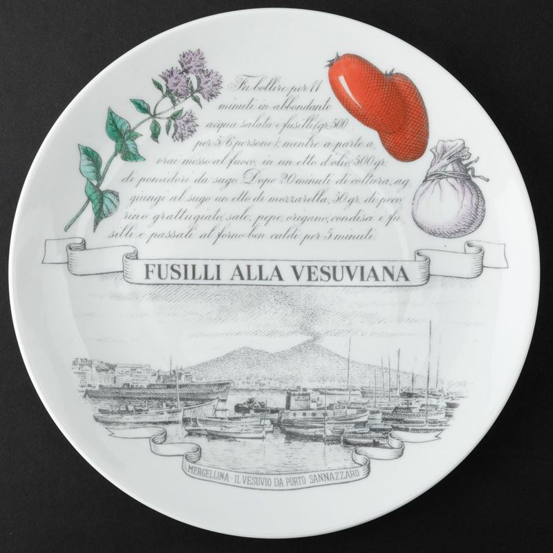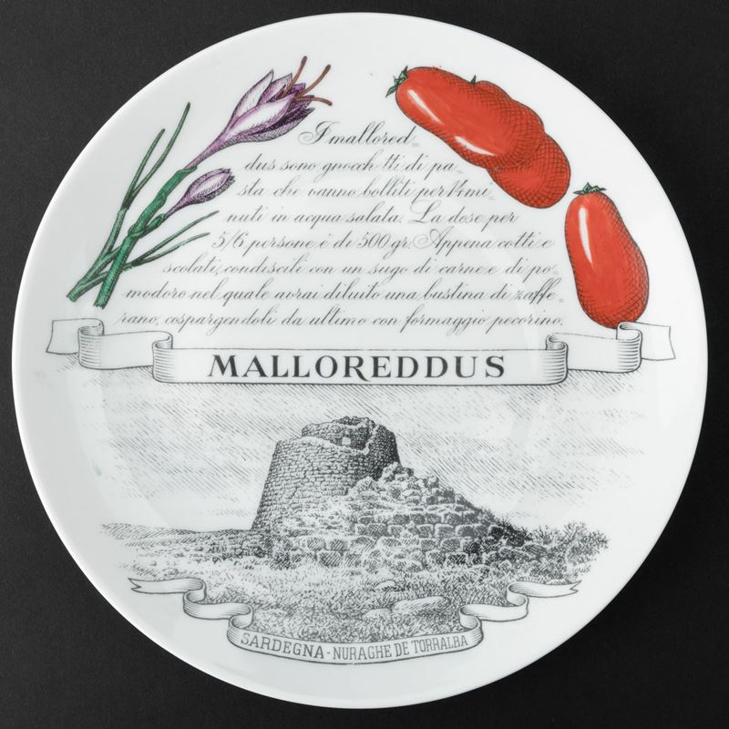Lotto formato da sei piatti serie Piatti Tipici Regionali in porcellana con decoro serigrafato policromo. Realizzati per i clienti del Pastificio Audisio.