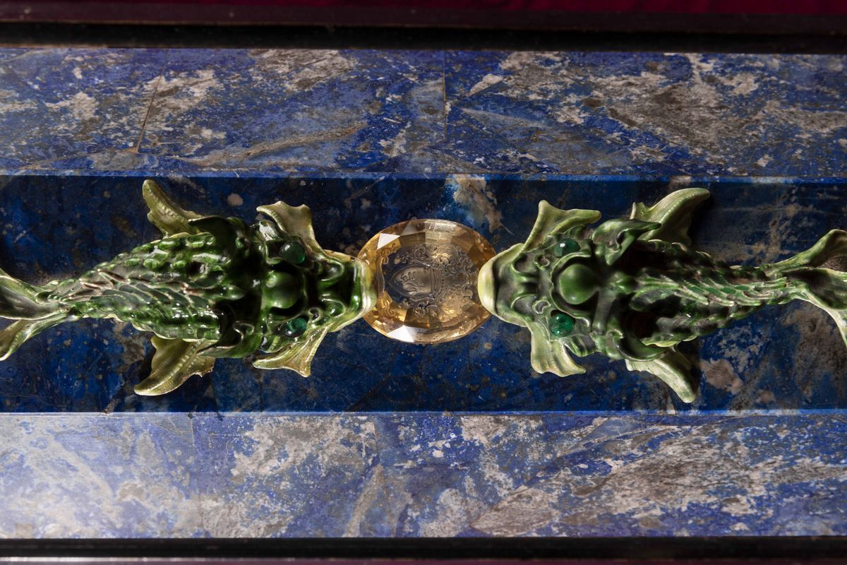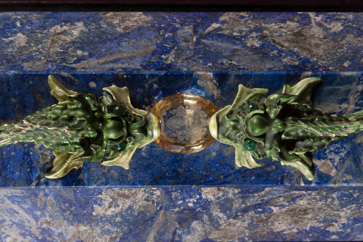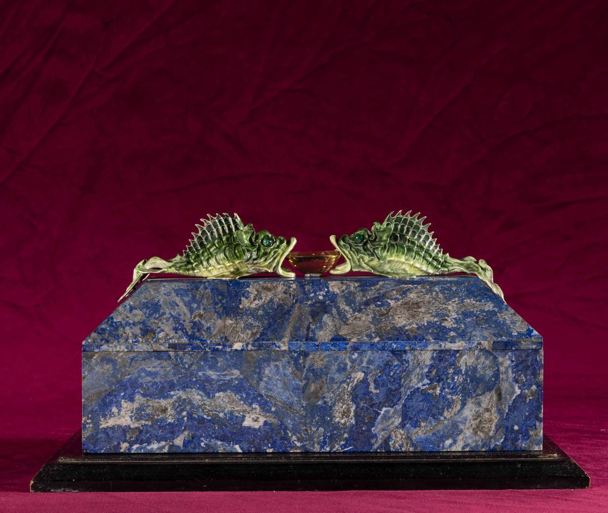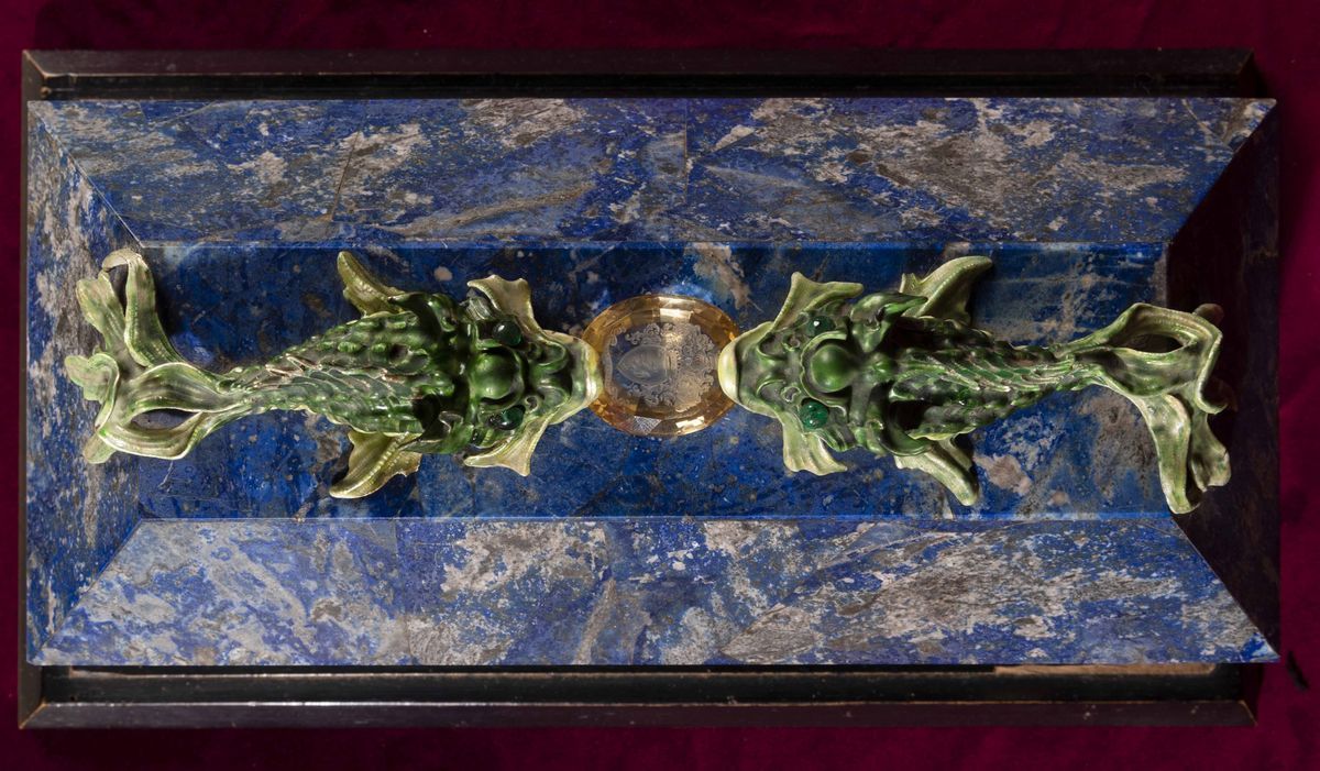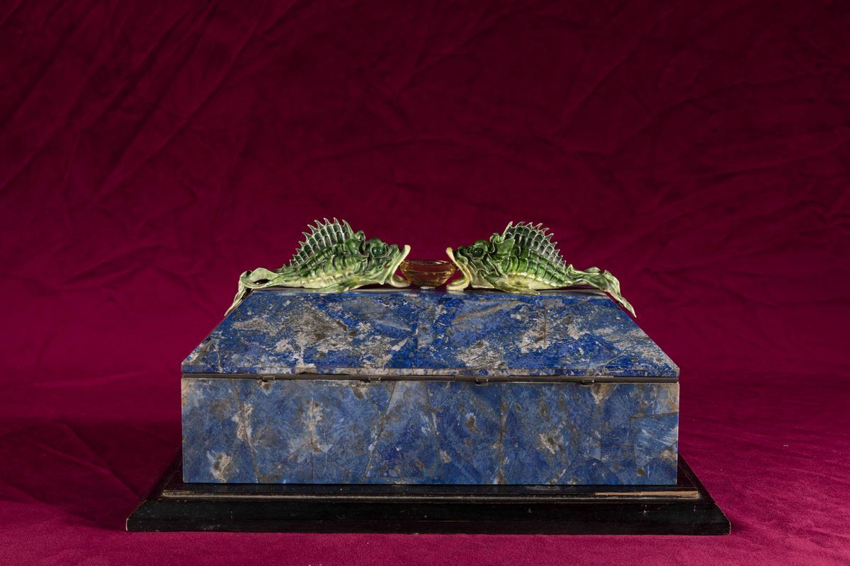 Rara scatola lastronata in lapislazzuli con decoro di pesci in argento e smalti policromi reggenti gemma sfaccettata con inciso lo stemma della famiglia Volpi