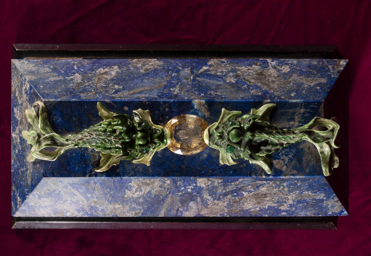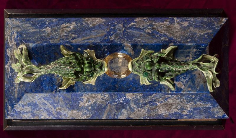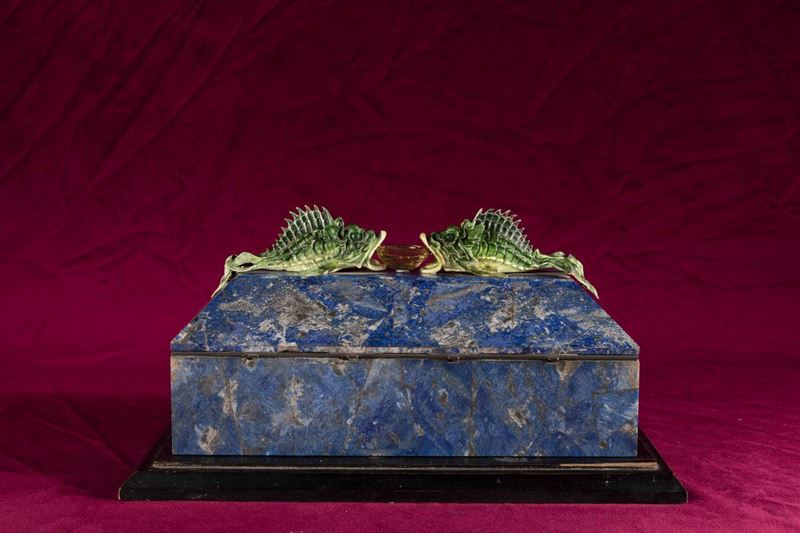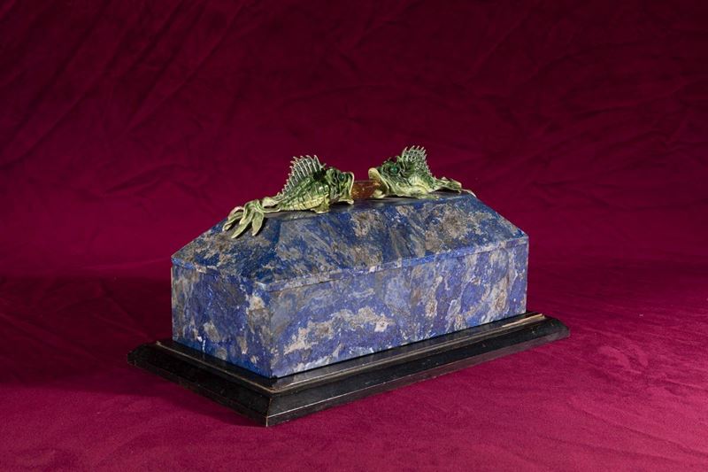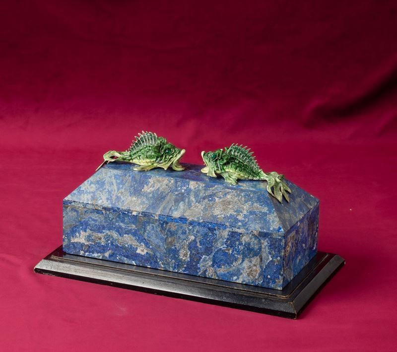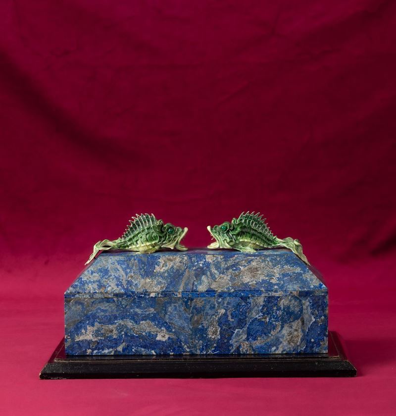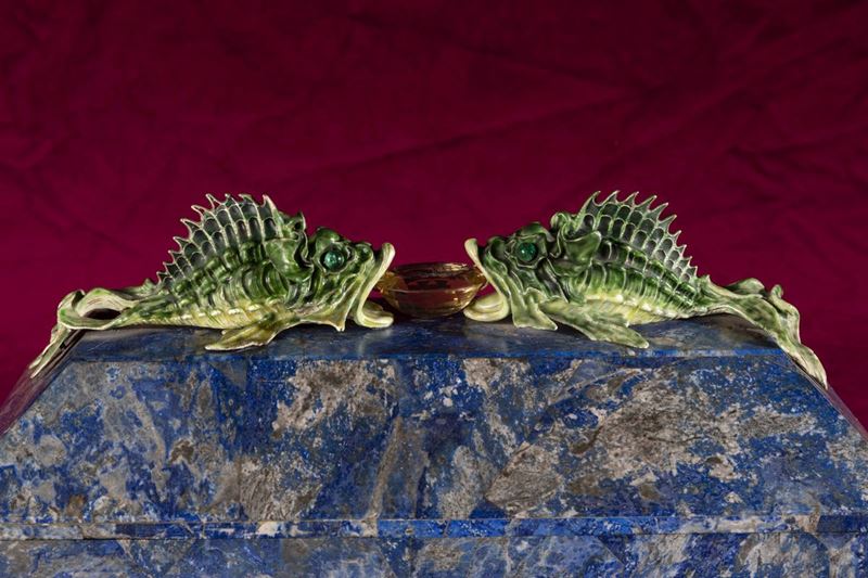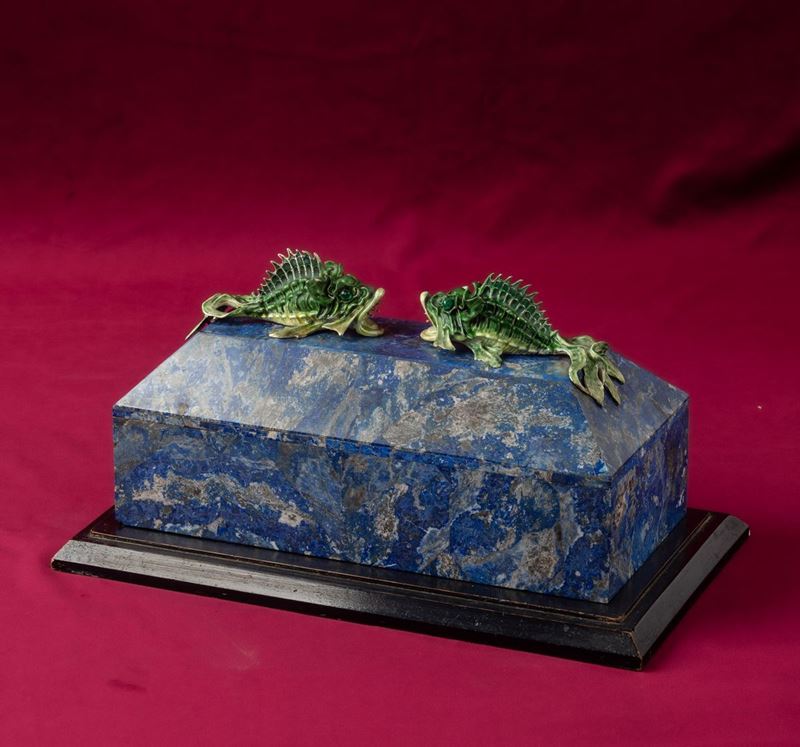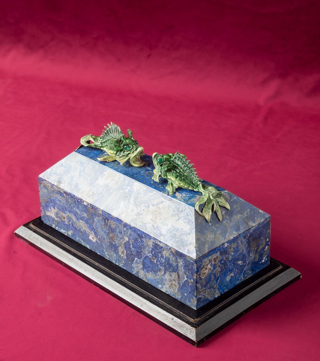 Rara scatola lastronata in lapislazzuli con decoro di pesci in argento e smalti policromi reggenti gemma sfaccettata con [..]