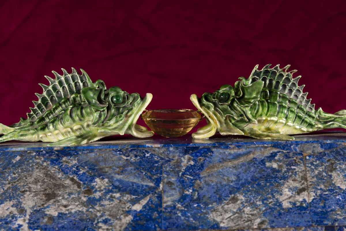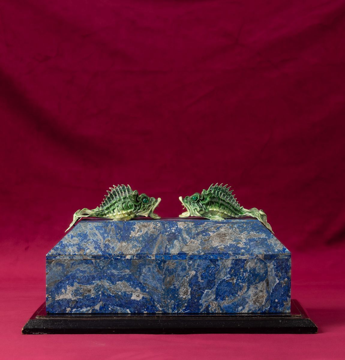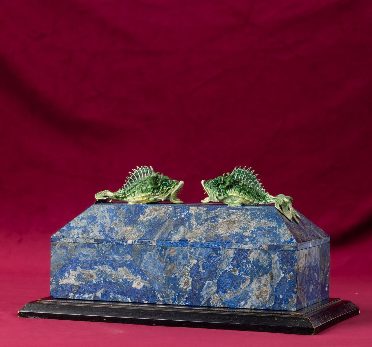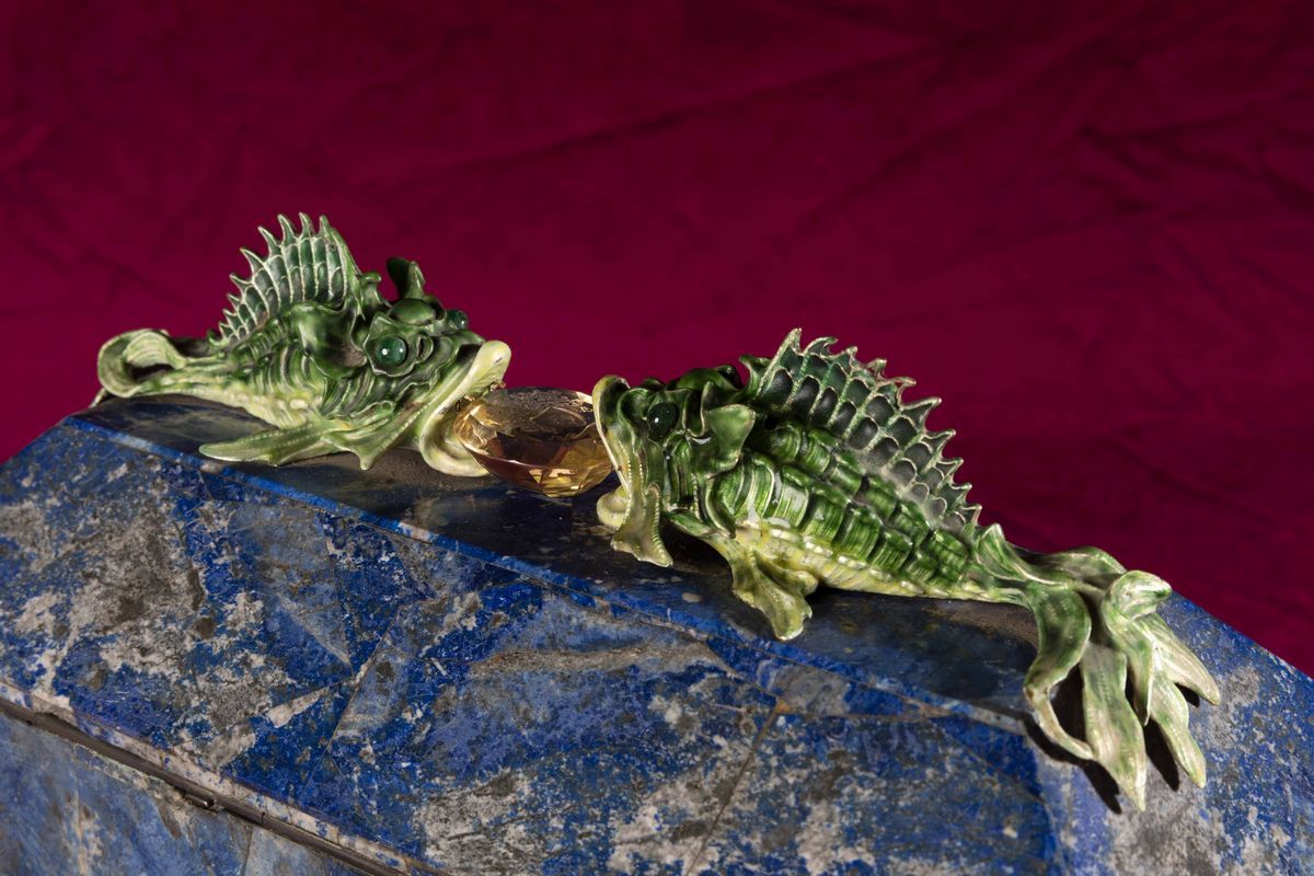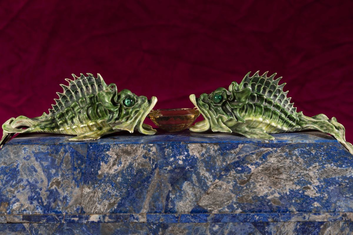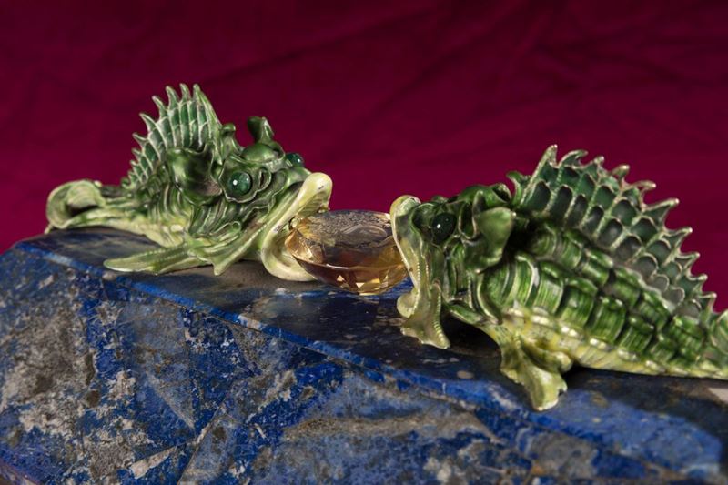 Rara scatola lastronata in lapislazzuli con decoro di pesci in argento e smalti policromi reggenti gemma sfaccettata con [..]