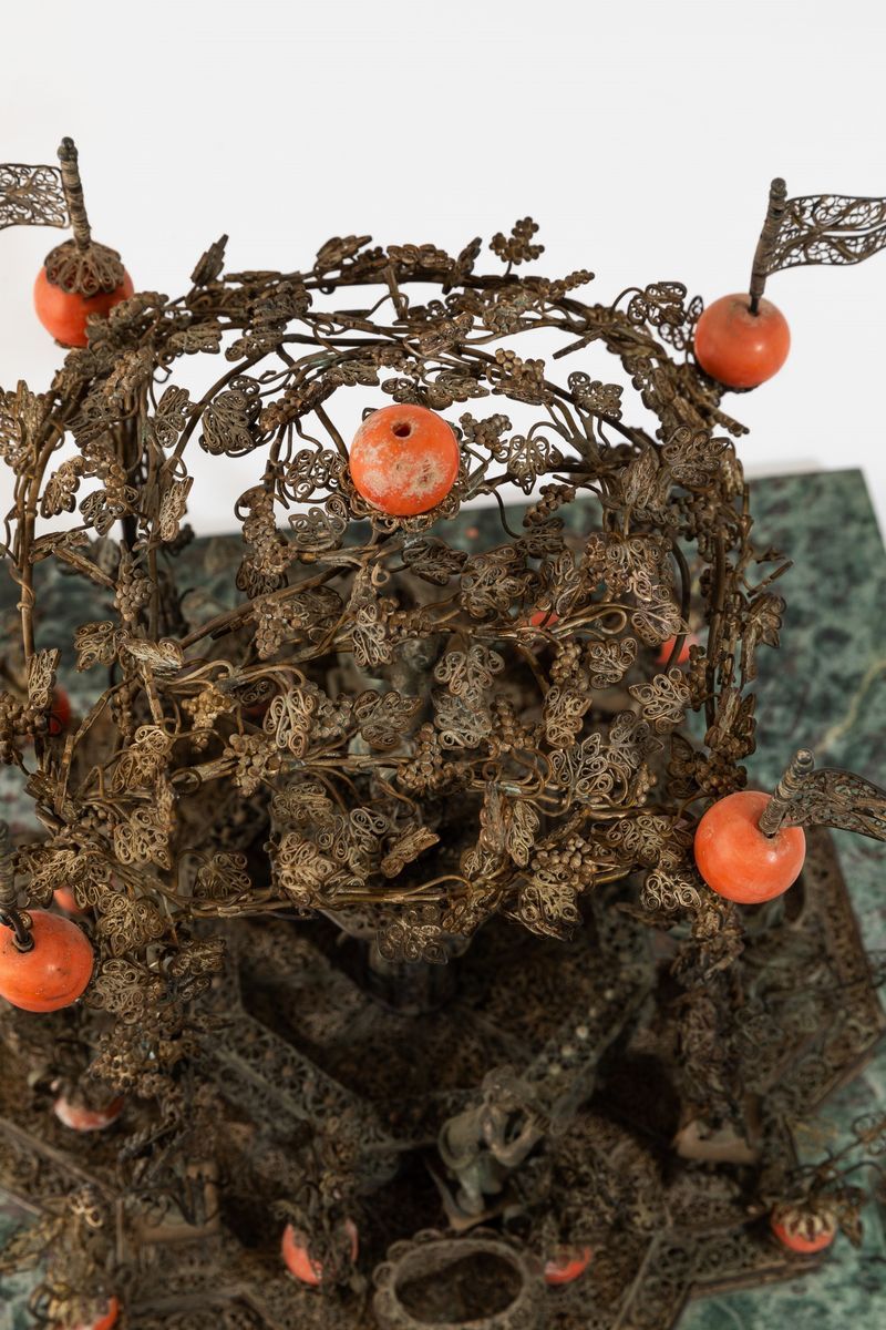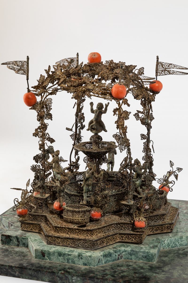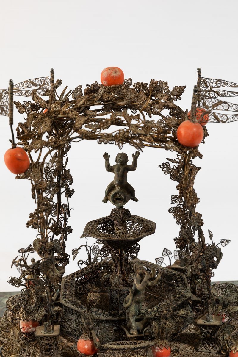 Centrotavola in forma di fontana in filigrana d'argento con inserti in corallo raffigurante scena bacchica. Probabilmente [..]