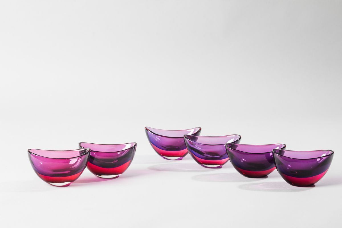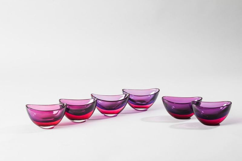 Lotto composto da sei coppe ovali in vetro sommerso rosso rubino blu.