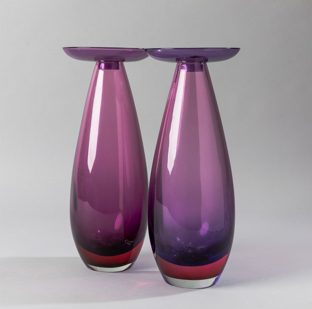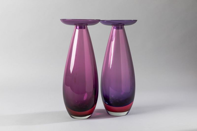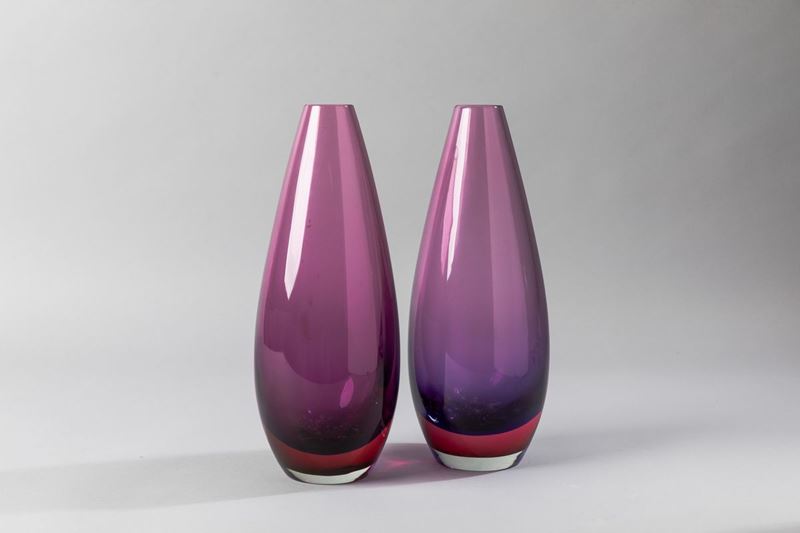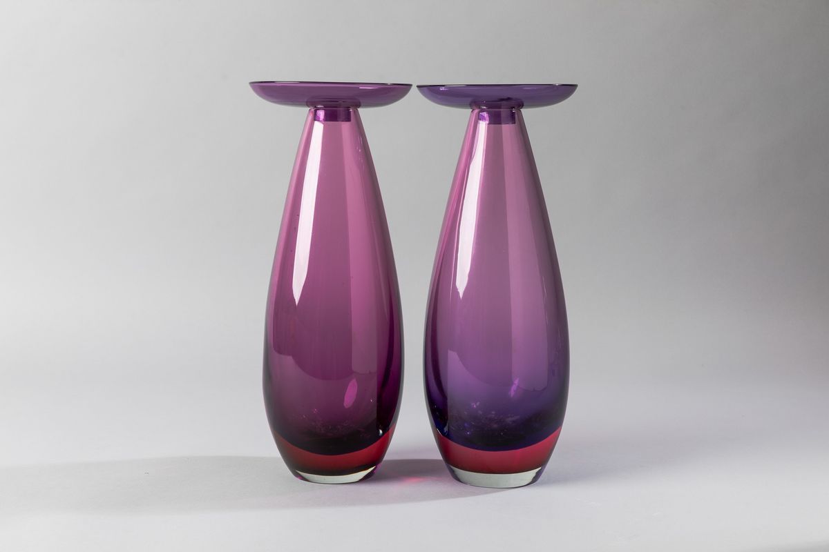 Coppia di vasi a goccia in vetro sommerso rosso rubino blu.