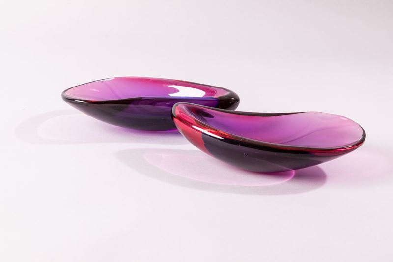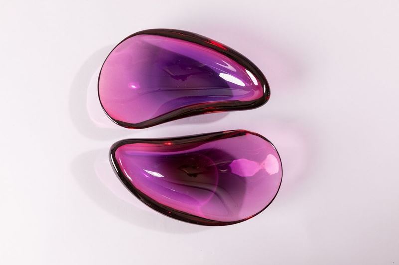 Due ciotole in forma di conchiglia in vetro sommerso rosso rubino blu.