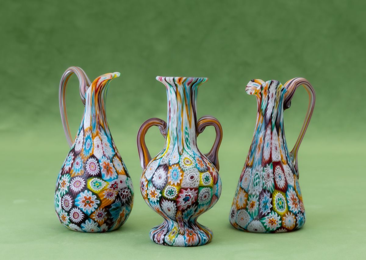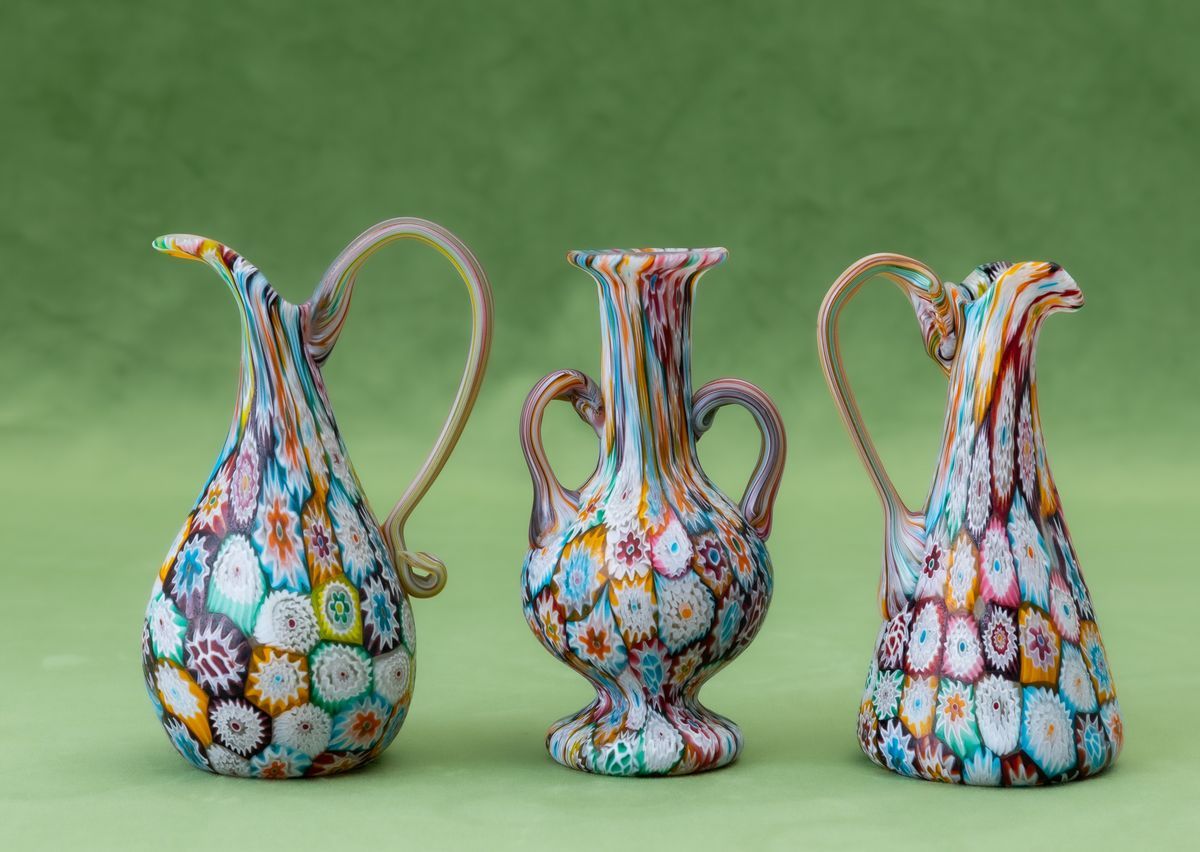 Lotto composto da due caraffe e un vaso in vetro con decoro di murrine carnevale multicolore e anse applicate. Vecchia etichetta cartacea.