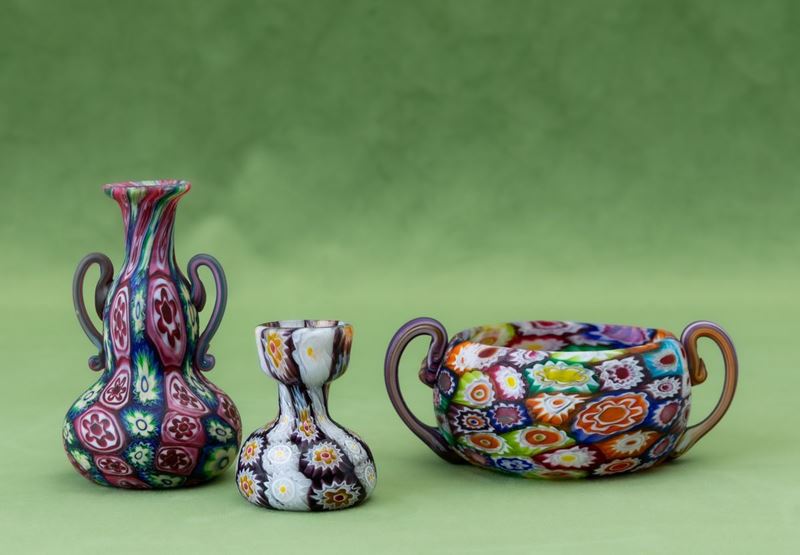 Lotto composto da due vasi e una ciotola in vetro con decoro di murrine multicolore.