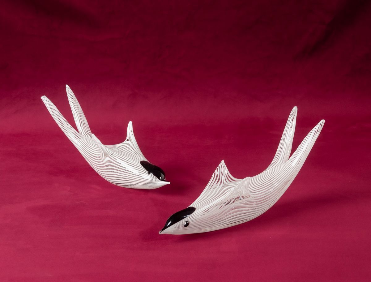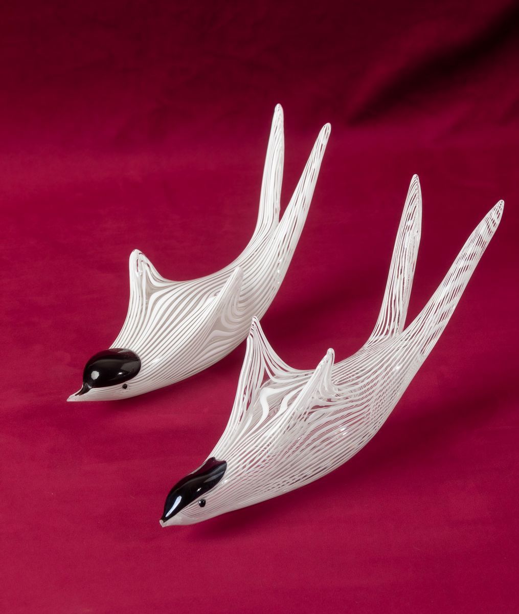 Coppia di rondini in vetro soffiato con decoro di canne lattimo e applicazioni in pasta vitrea nera.