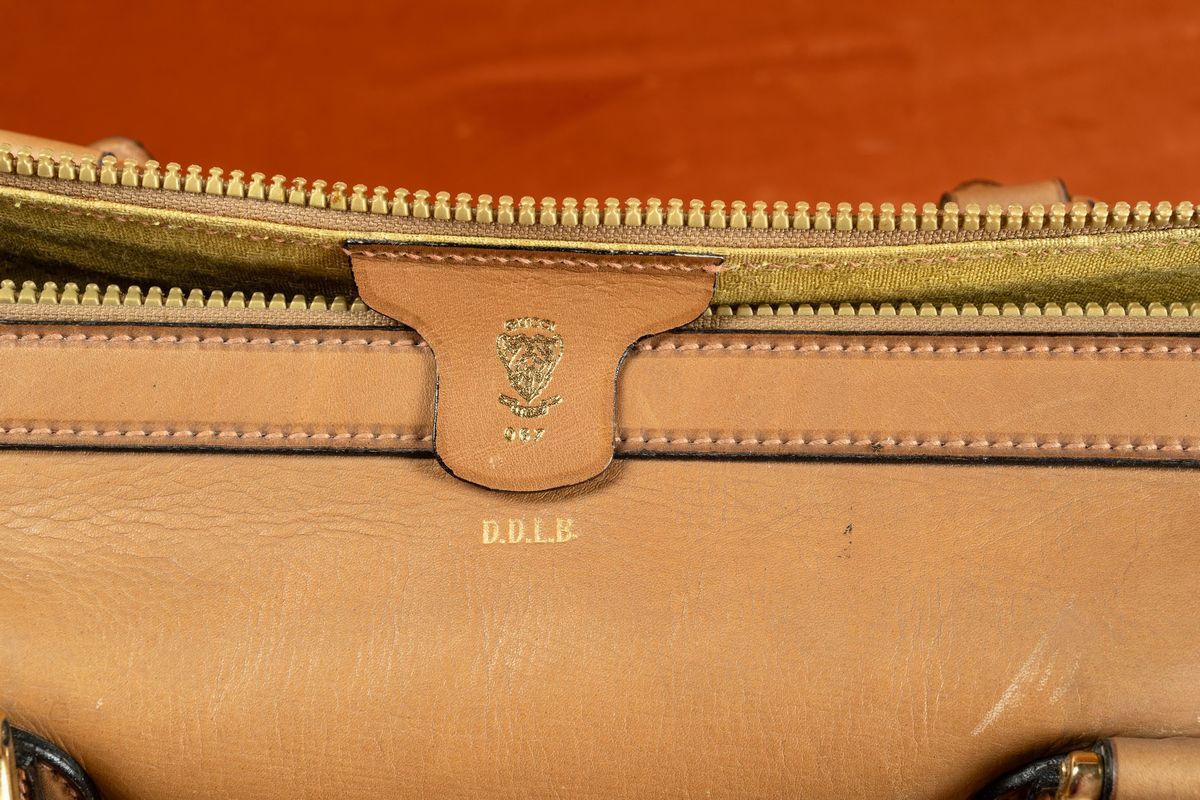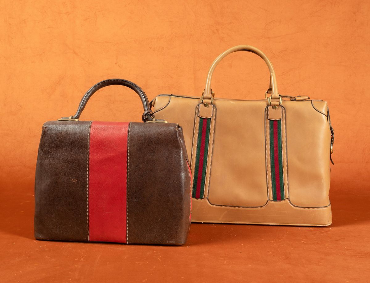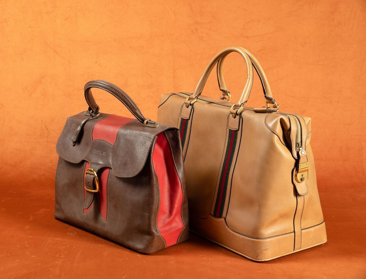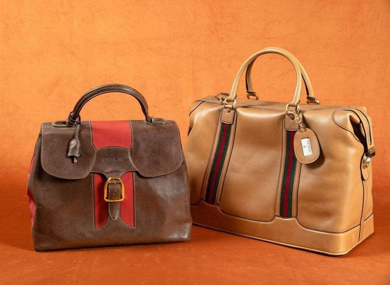 Due borse da viaggio in cuoio con inserti in tessuto con logo.