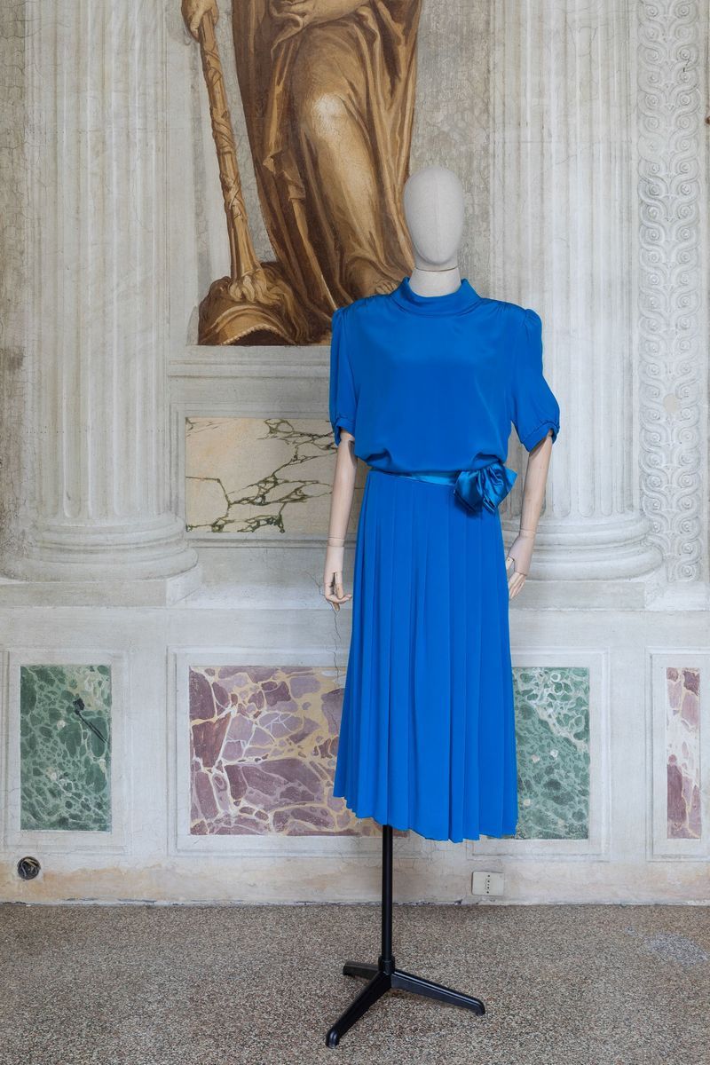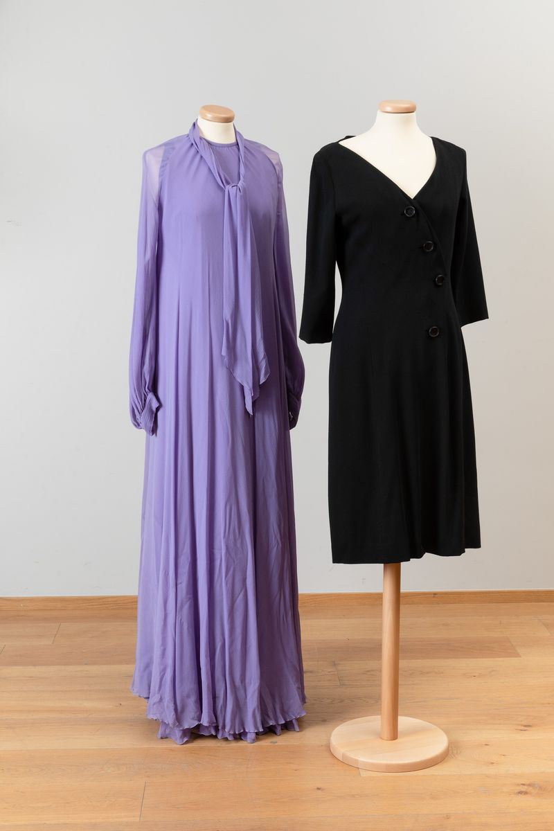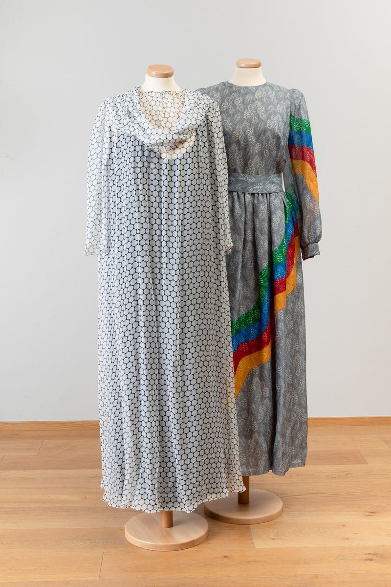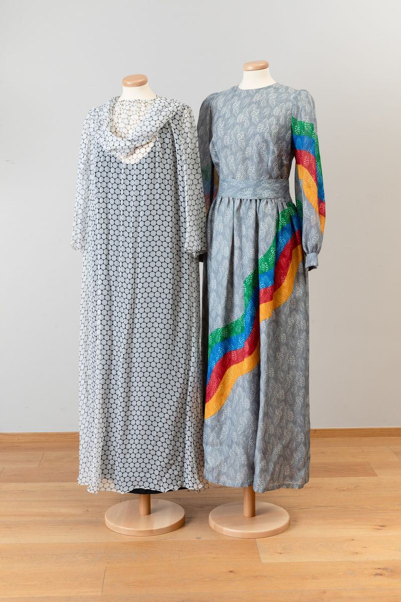Abito lungo bluette con gonna a balze, maniche a sbuffo, fascia di seta in vita; abito in chiffon di seta stampato arricciato al collo Noris Mode; abito lungo in chiffon di seta stampato con motivo a piume e fascia a quattro colori, arricciato in vita con fascetta nello stesso tessuto; abito in seta stampato con motivi floreali e plissettato, abbottonatura centrale, Aiazzi Fantechi - Firenze, anni ’70; abito da sera a bande di pizzo e tessuto plissettato; abito in tela di cotone indiana, fusciacca dello stesso tessuto; scamiciato in viscosa sartoria Giunta Milano, lungo al ginocchio con sormonto a portafoglio, quattro bottoni.