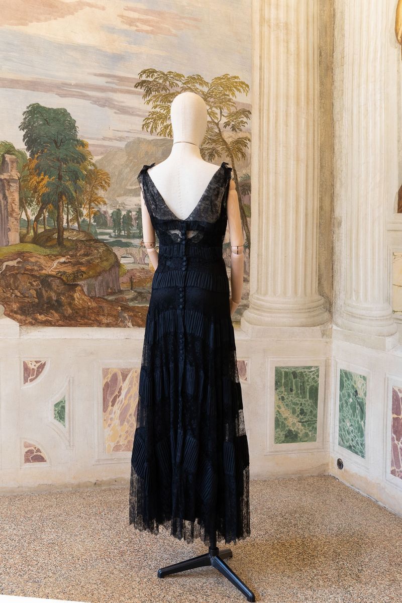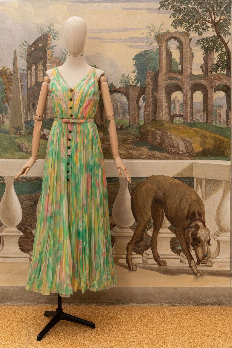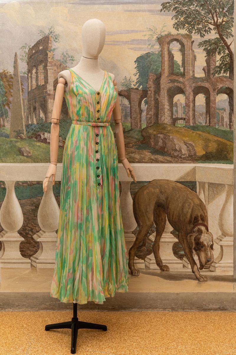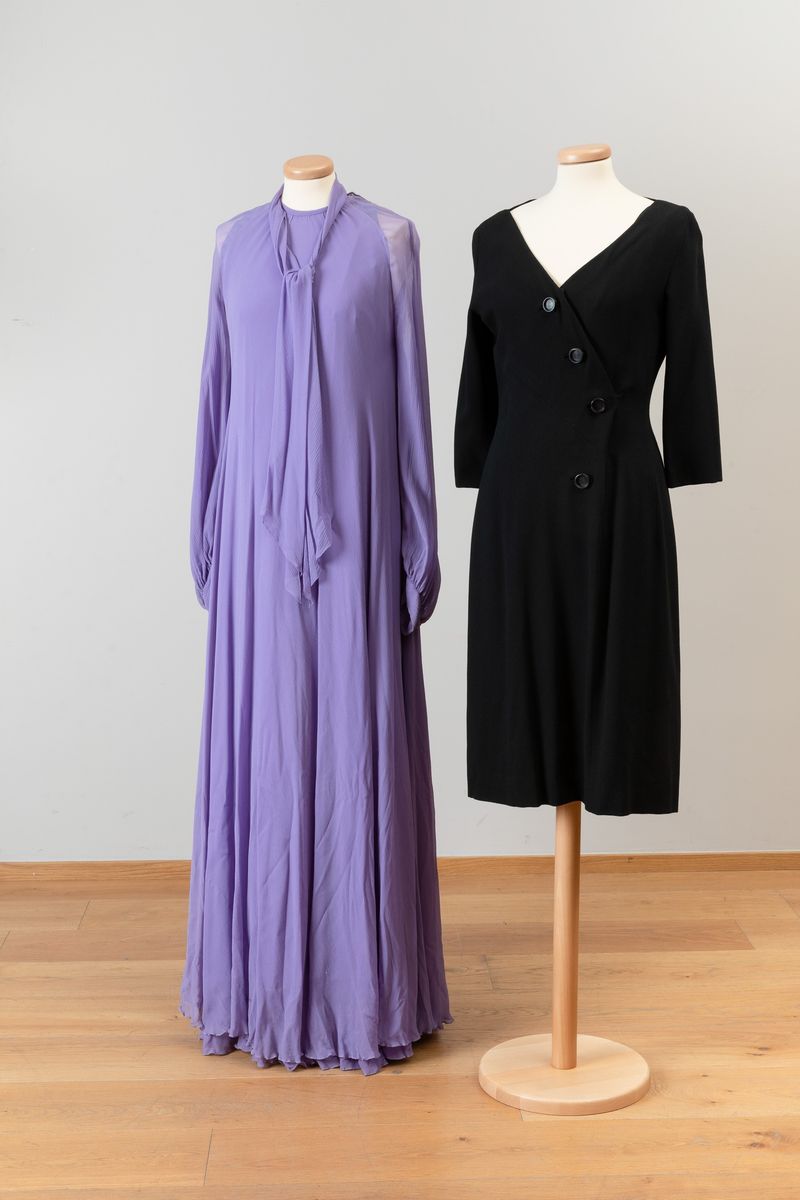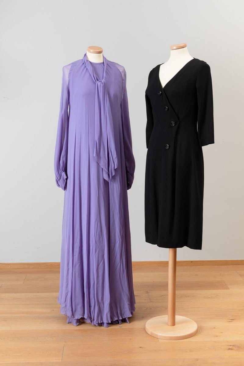 Abito lungo bluette con gonna a balze, maniche a sbuffo, fascia di seta in vita; abito in chiffon di seta stampato arricciato al collo Noris Mode; abito lungo in chiffon di seta stampato con motivo a piume e fascia a quattro colori, arricciato in vita con fascetta nello stesso tessuto; abito in seta stampato con motivi floreali e plissettato, abbottonatura centrale, Aiazzi Fantechi - Firenze, anni ’70; abito da sera a bande di pizzo e tessuto plissettato; abito in tela di cotone indiana, fusciacca dello stesso tessuto; scamiciato in viscosa sartoria Giunta Milano, lungo al ginocchio con sormonto a portafoglio, quattro bottoni.