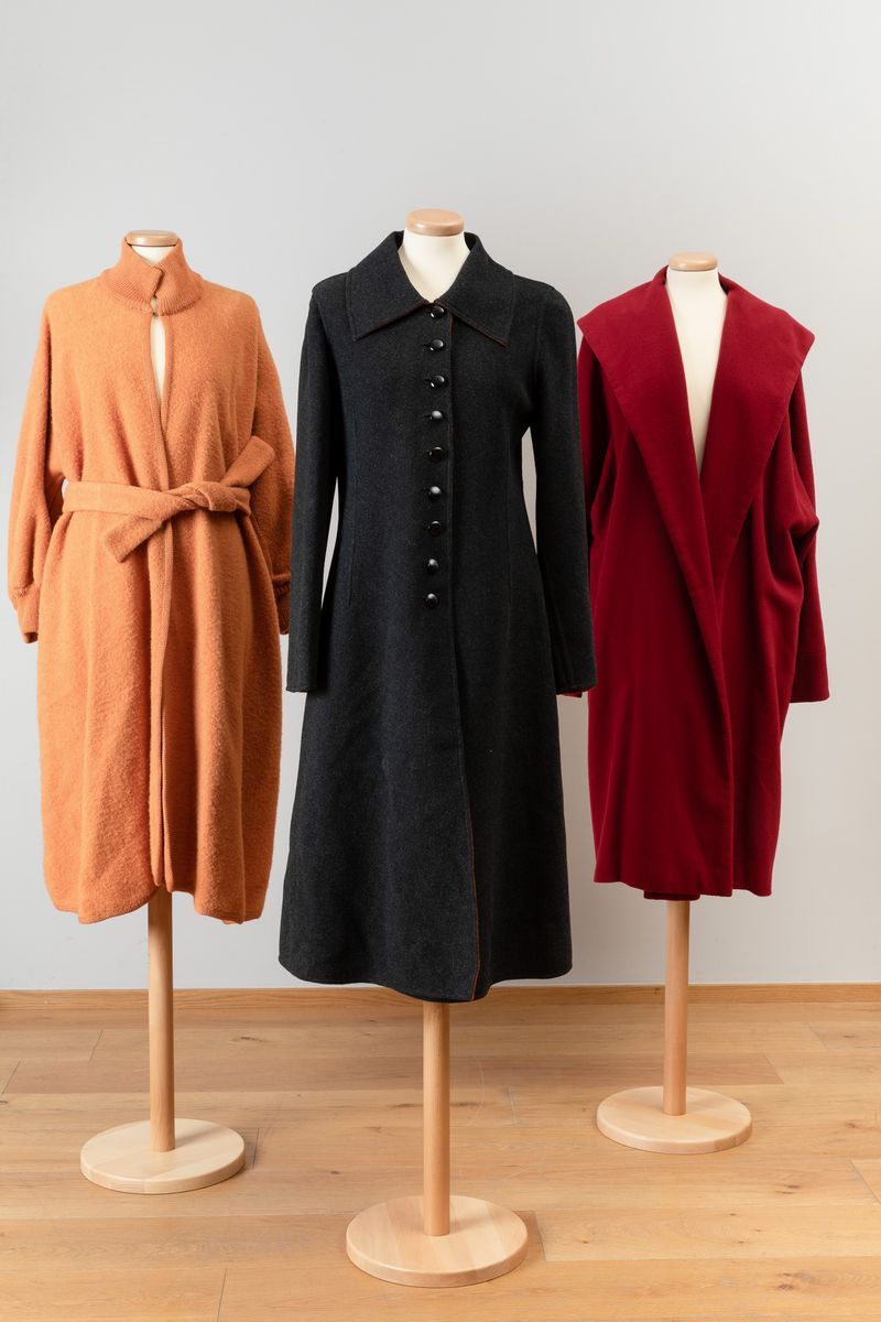Cappotto reversibile in lana grigio e mattone; cappotto a uovo in tessuto di lana color bordeaux e ampio collo a scialle, etichetta Anna Maria Sopelsa; cappotto in maglia di lana mohair e lana pettinata per finiture, scollo, passanti cintura con etichetta Maskit - Israele