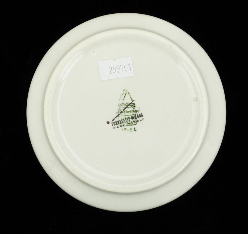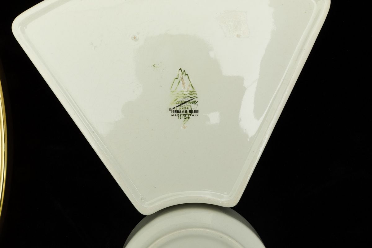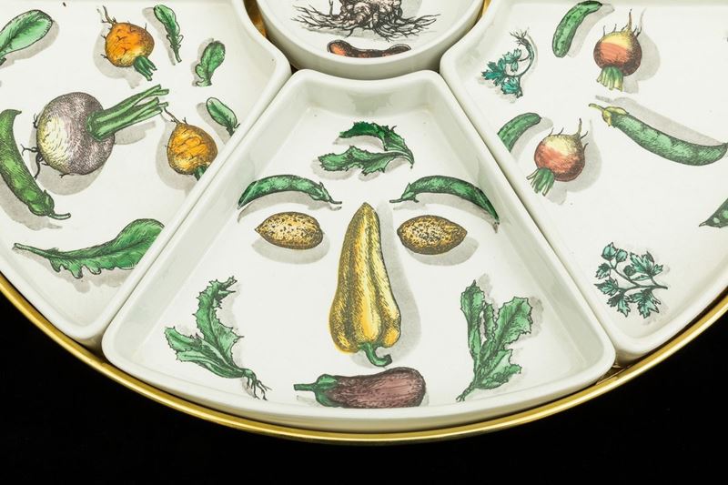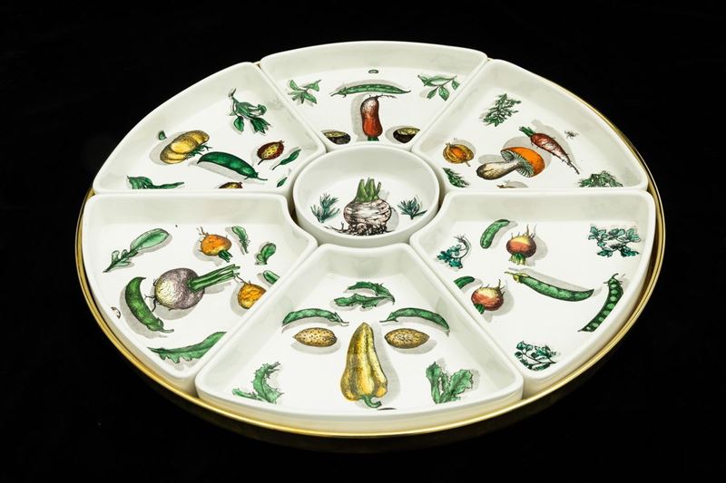 Antipastiera formata da sei vasche trapezoidali e una centrale rotonda in terraglia a colaggio con decoro serigrafato arcimboldesco. Marchi della manifattura e ceramica Laveno. Supporto a vassoio rotondo in ottone.