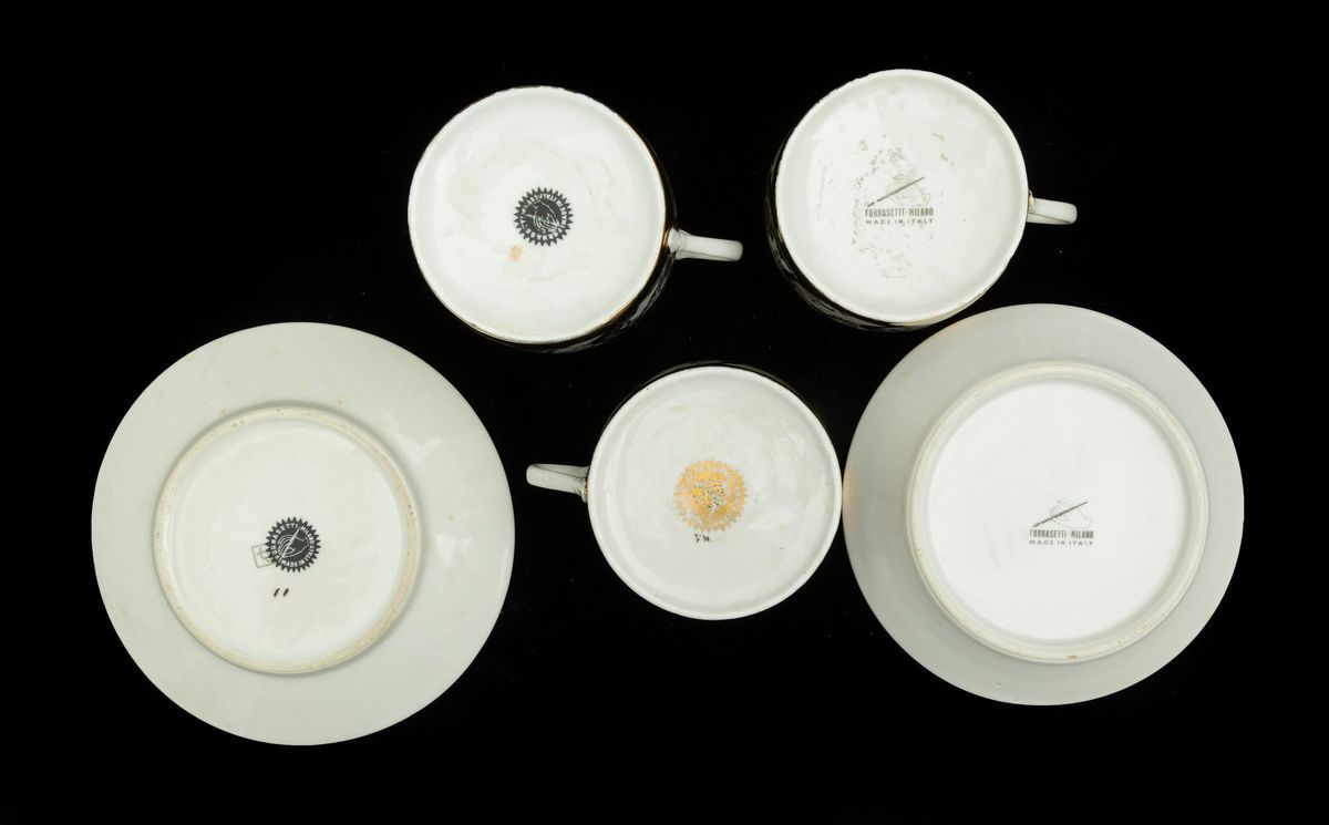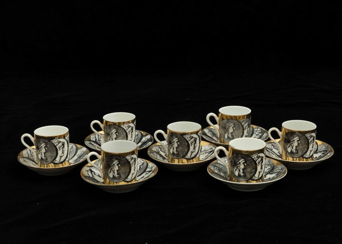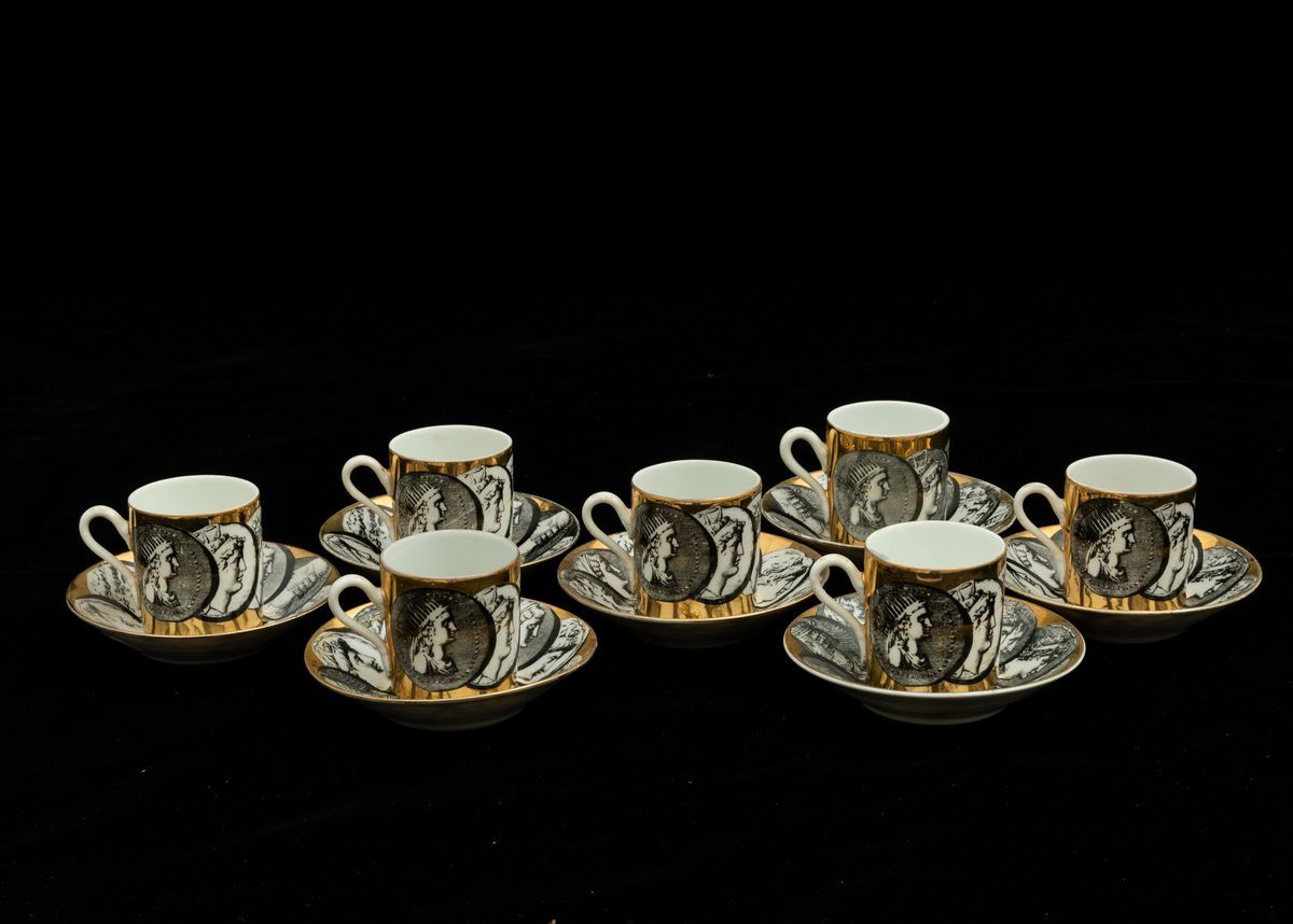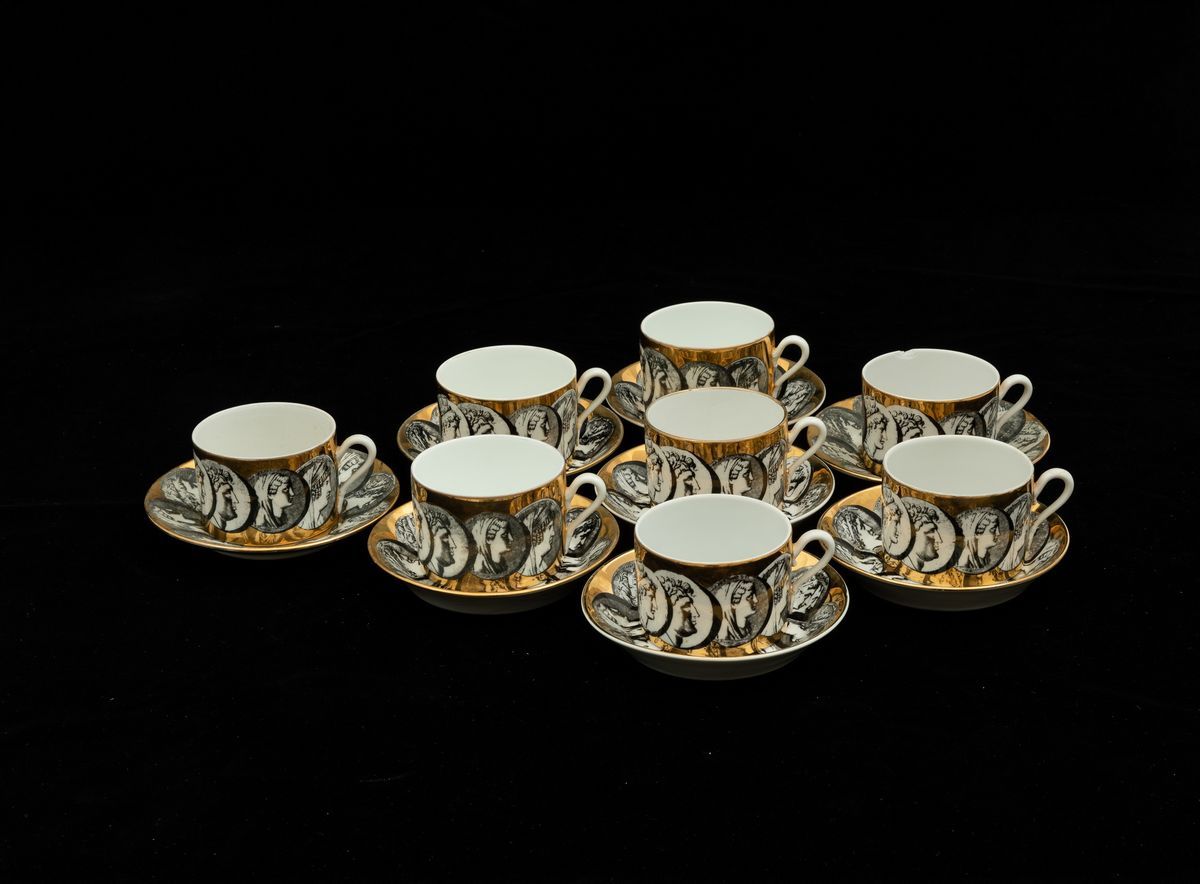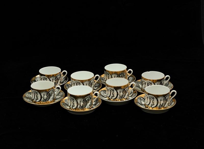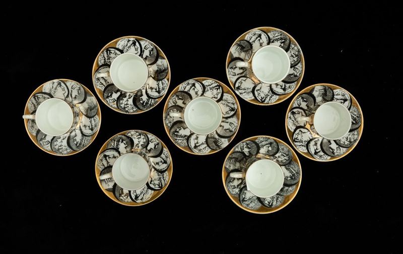Sette tazzine da caffè con otto piattini e otto tazze da tè con piattini in porcellana a decoro di medaglioni.