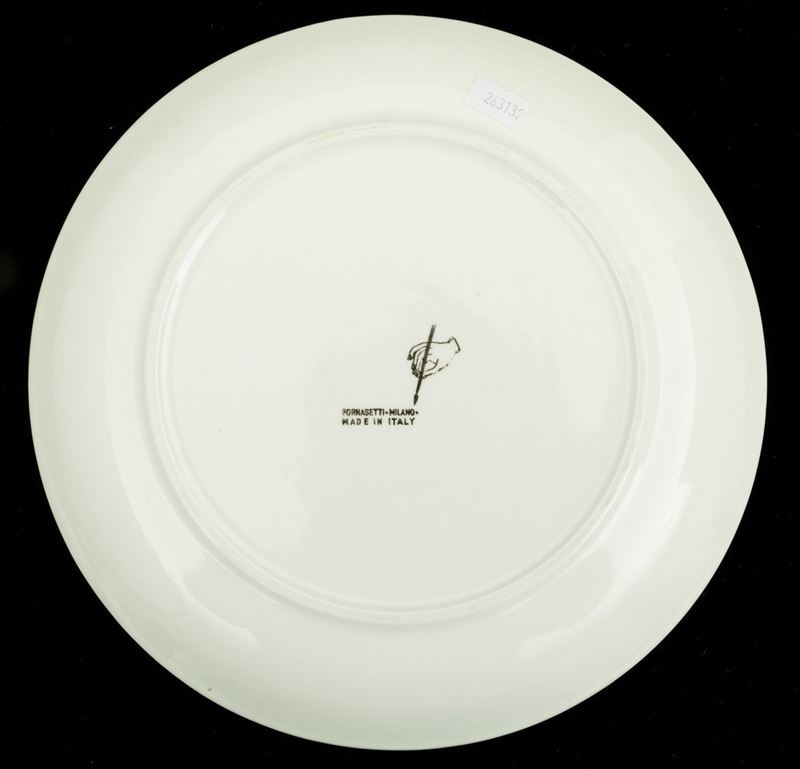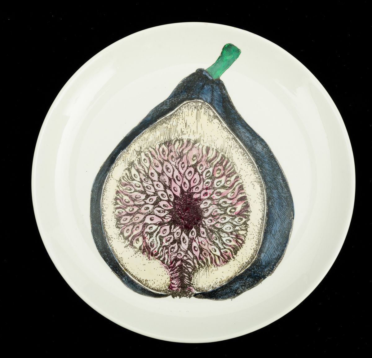 Cinque piatti in terraglia con decoro serigrafato di sezioni di frutta.