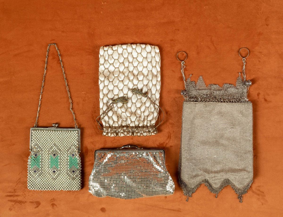 Quattro borse a bustina con decori e motivi metallici