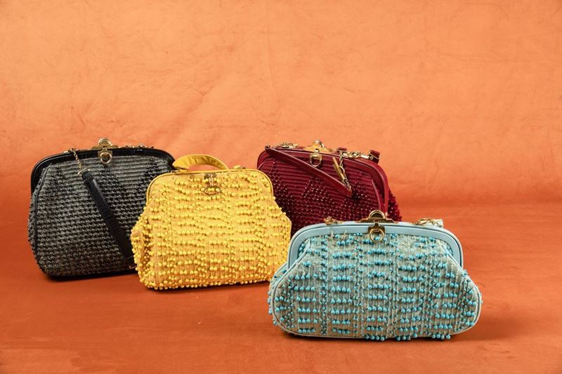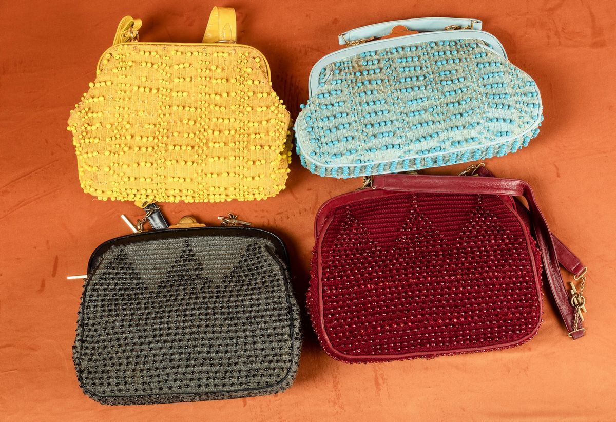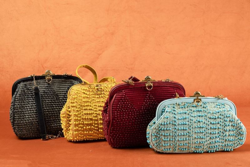 Quattro borse nel tessuto inventato da Elda Cecchele in corda ricamata con perline, in diversi motivi.