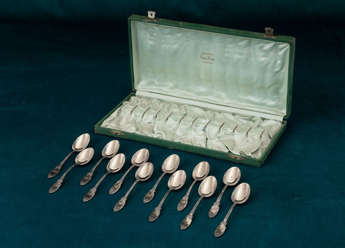 Set di dodici cucchiaini in argento dorato, entro custodia Oreficeria Ern. Fiori, Milano. Argenteria italiana del XX secolo