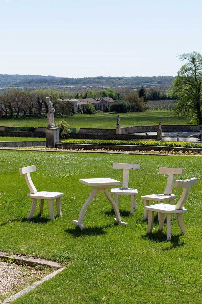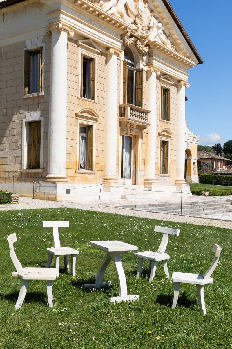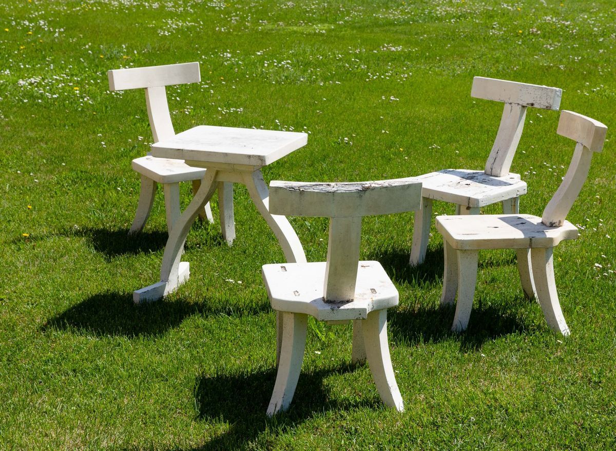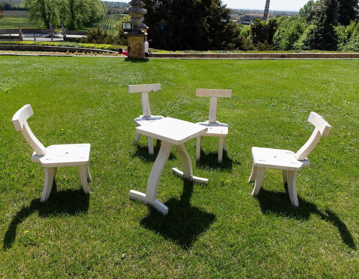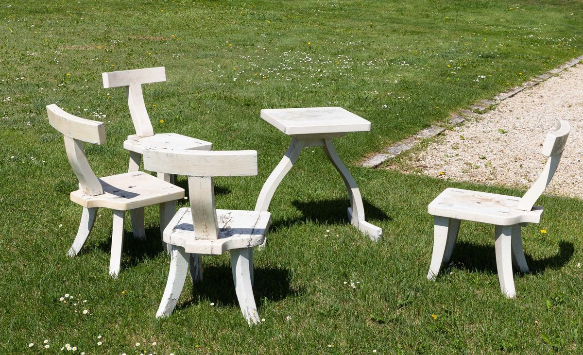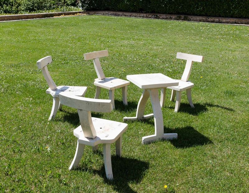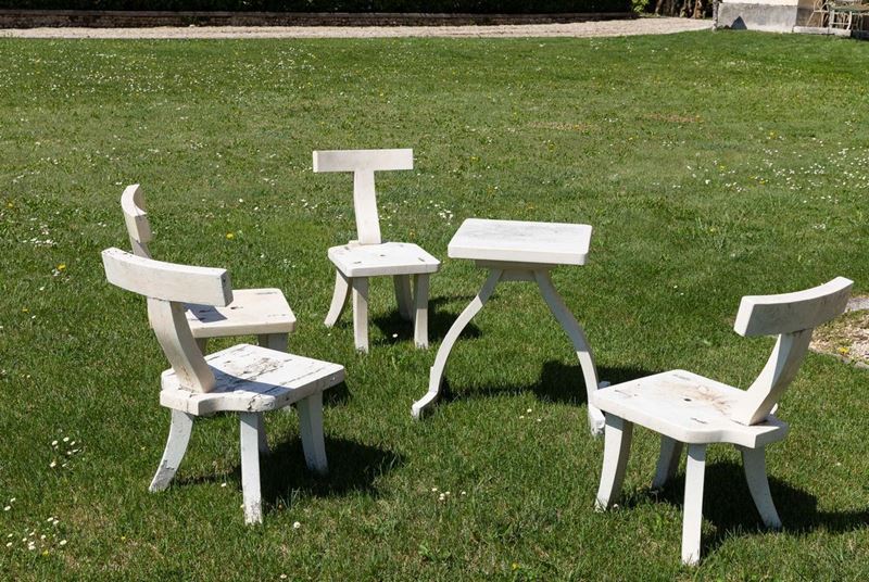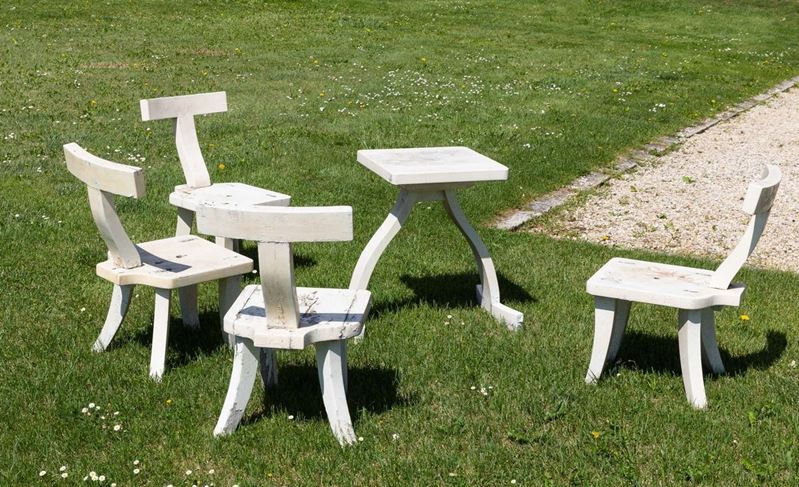 Un tavolo e quattro sedie da giardino in legno laccato bianco.