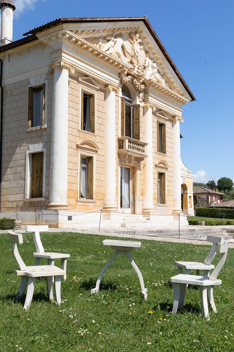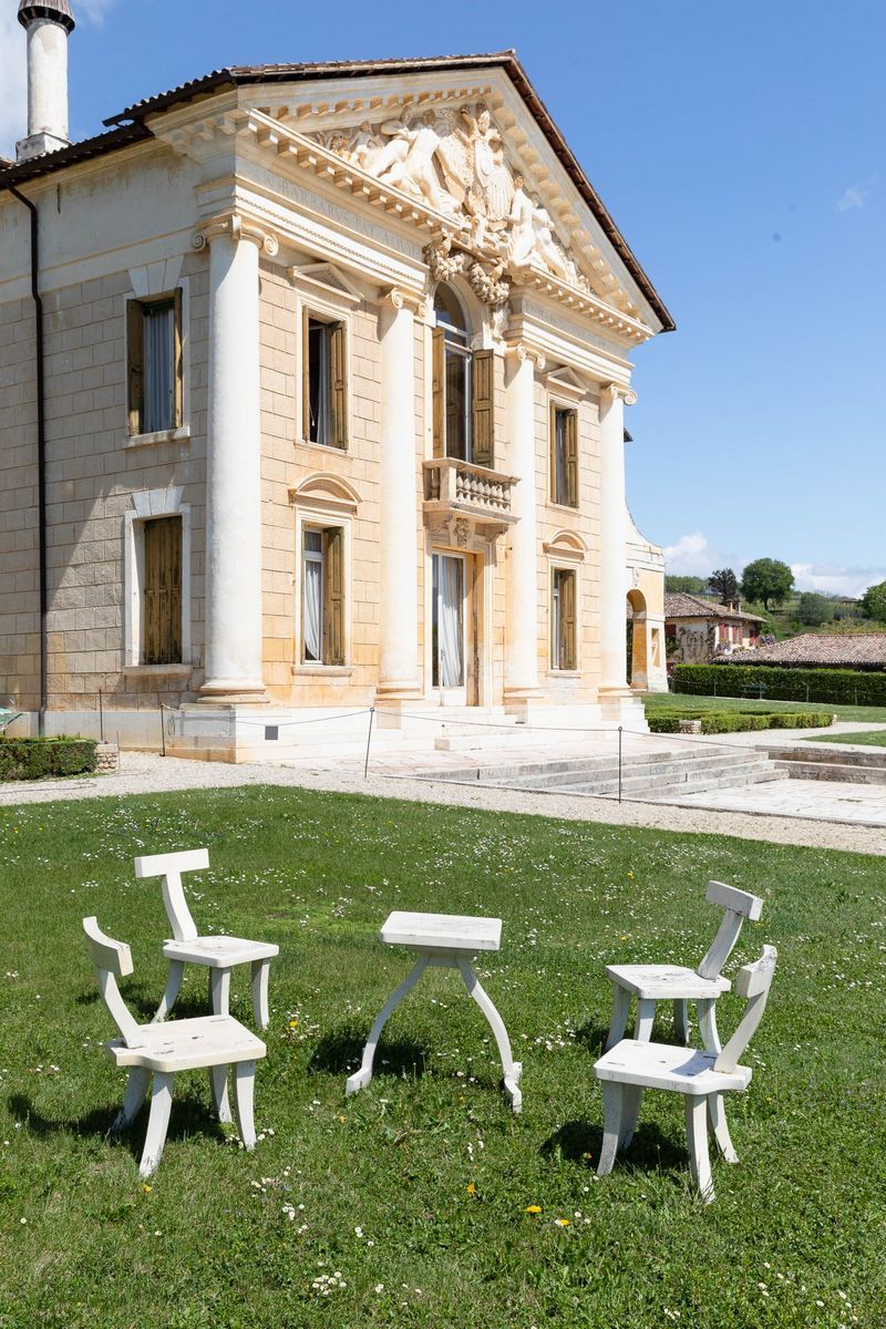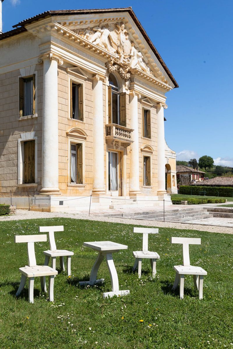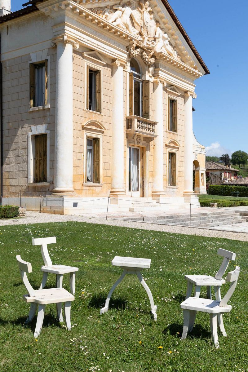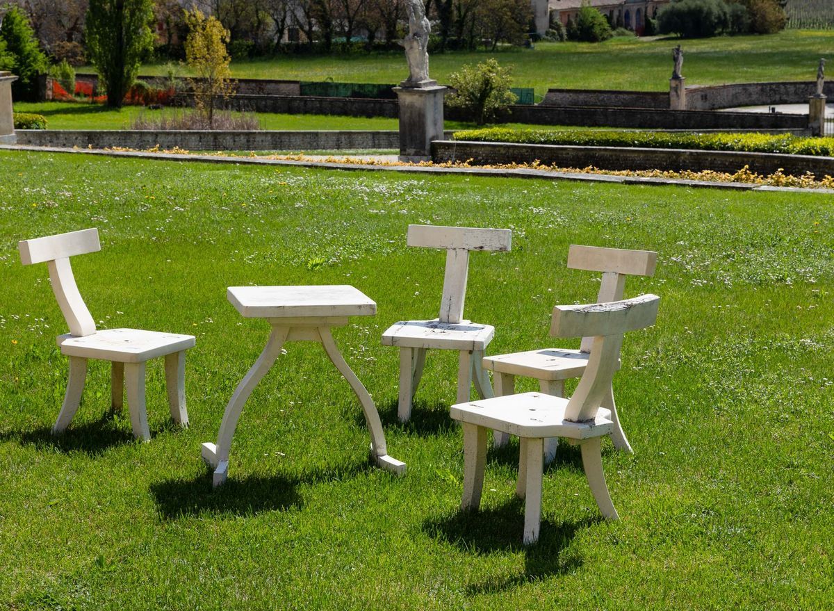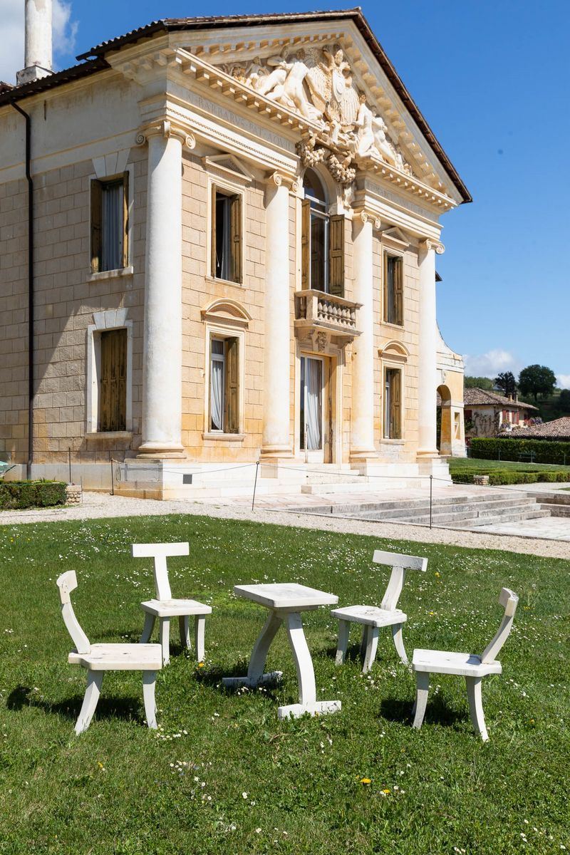 Un tavolo e quattro sedie da giardino in legno laccato bianco.