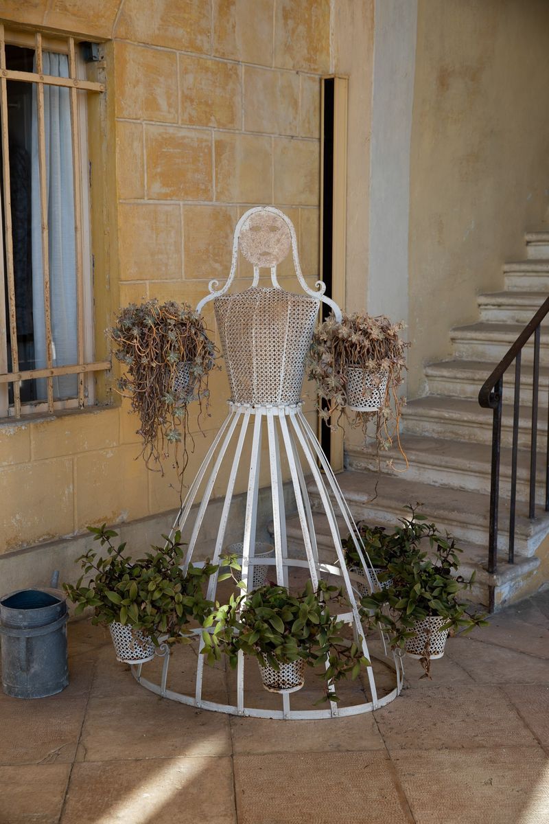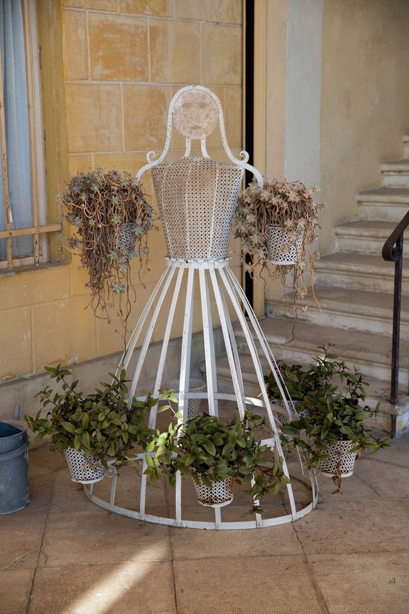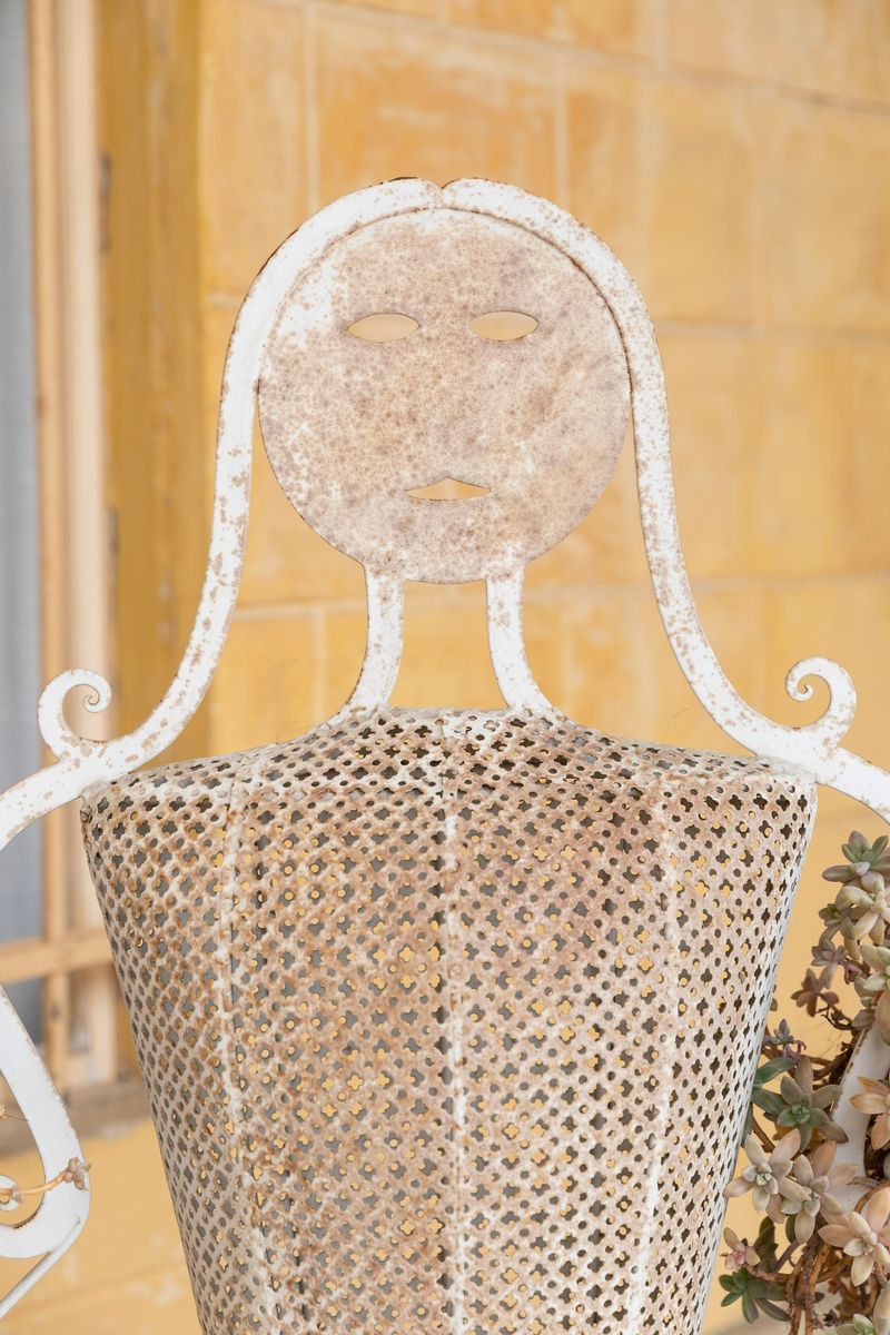 Servomuto in forma di figura femminile in ferro lavorato con portavasi in lamina traforata.