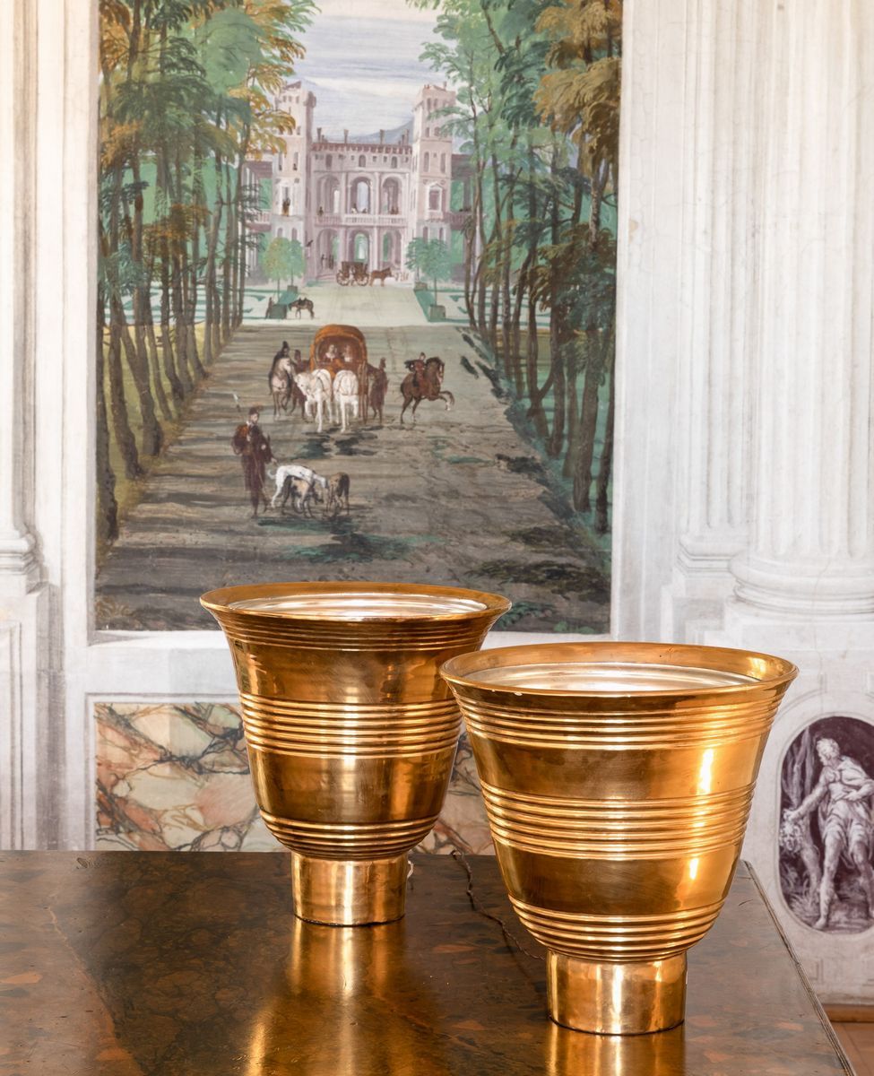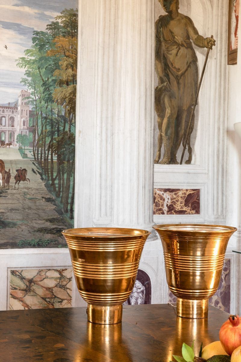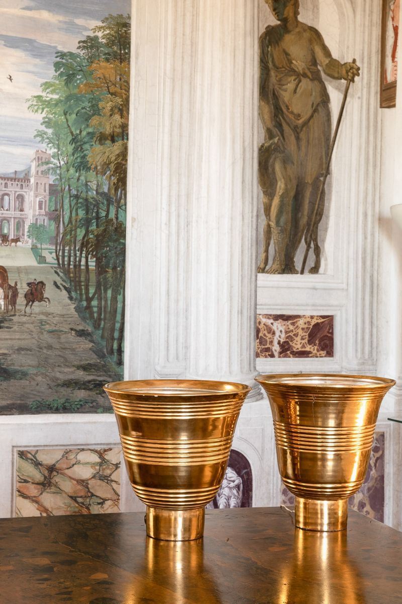 Coppia di lampade da tavolo in ceramica dorata con diffusore interno in alluminio.
