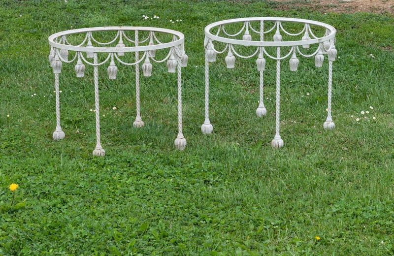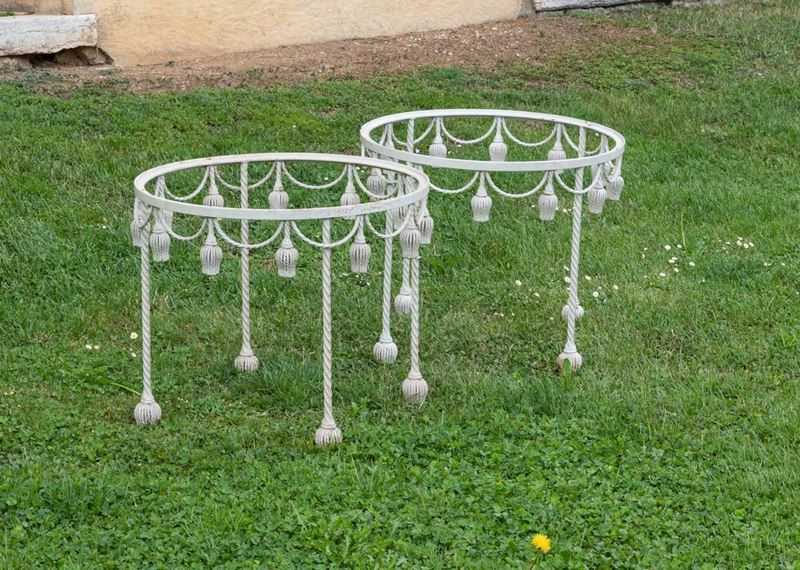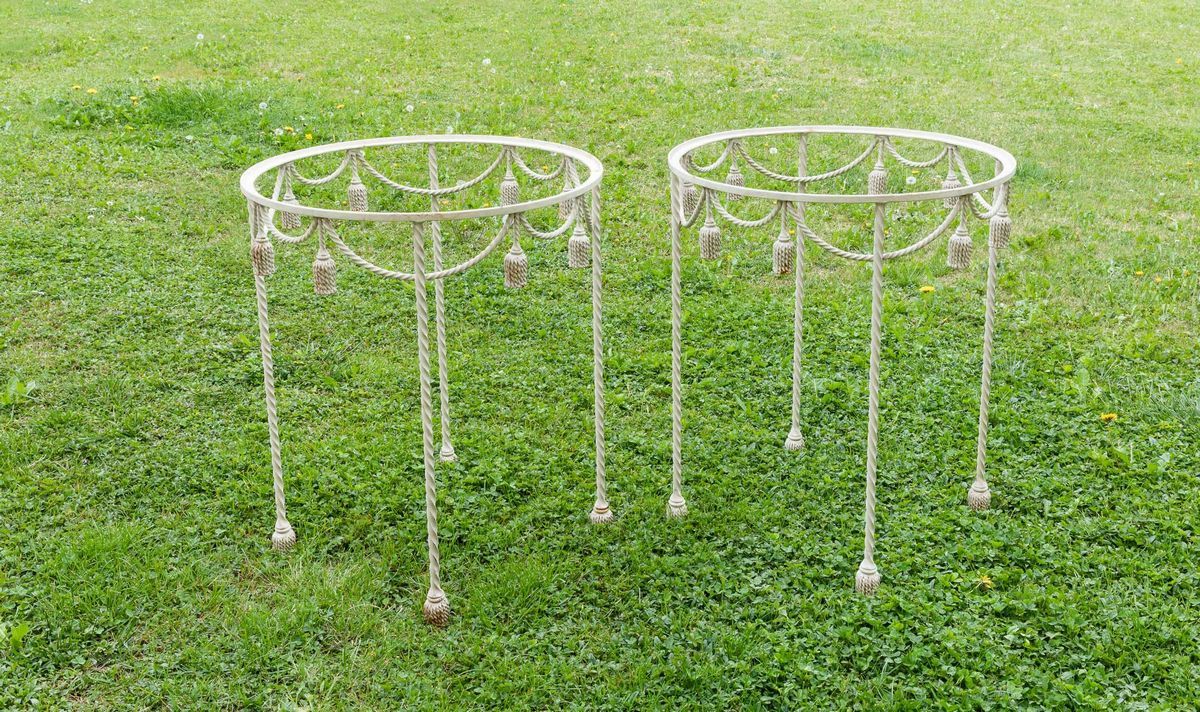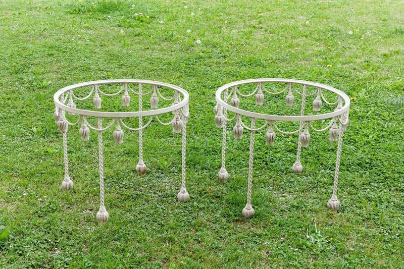 Coppia di tavolini in ferro con decoro di corde e nappe.