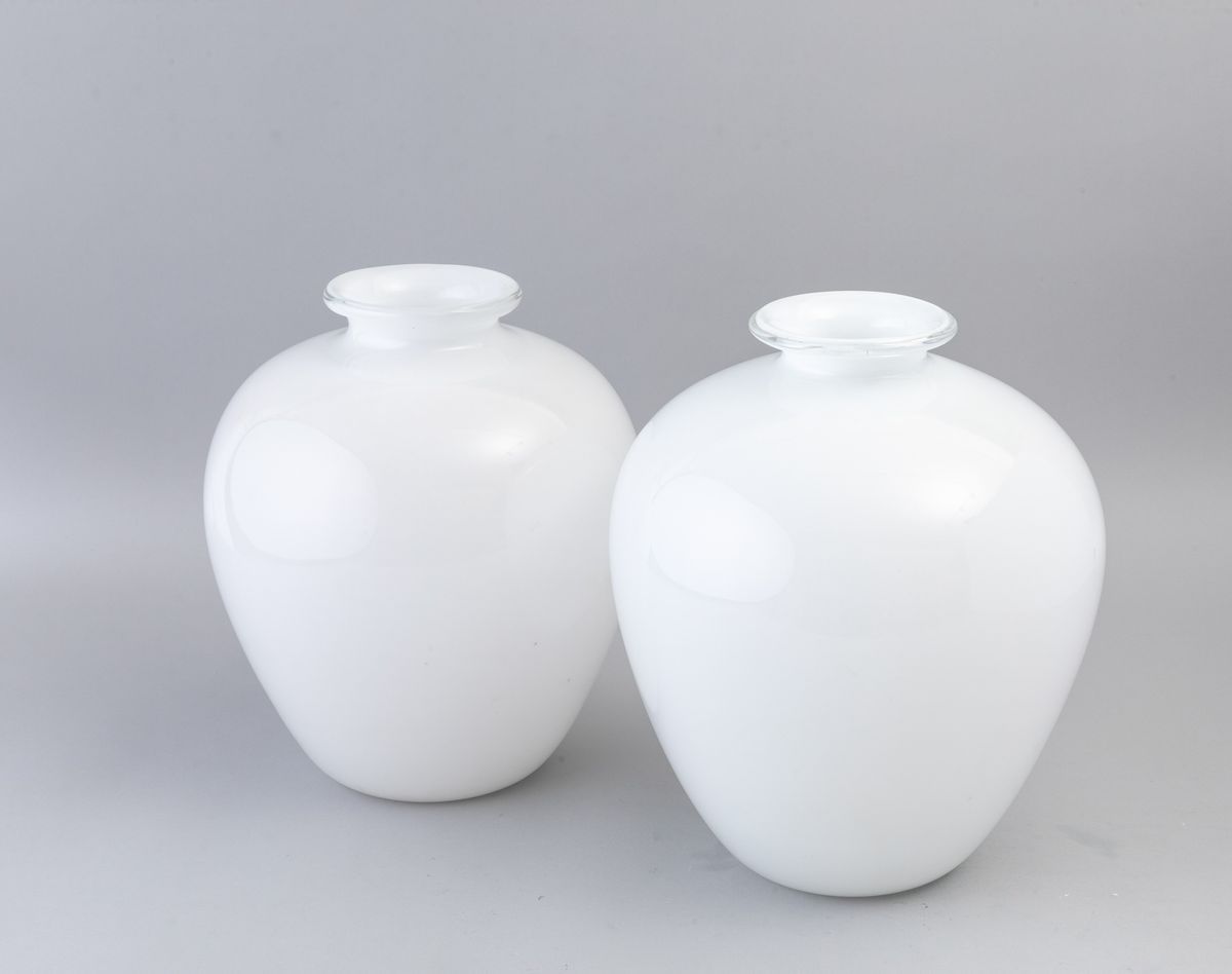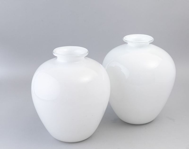 Coppia di vasi in vetro lattimo incamiciati.