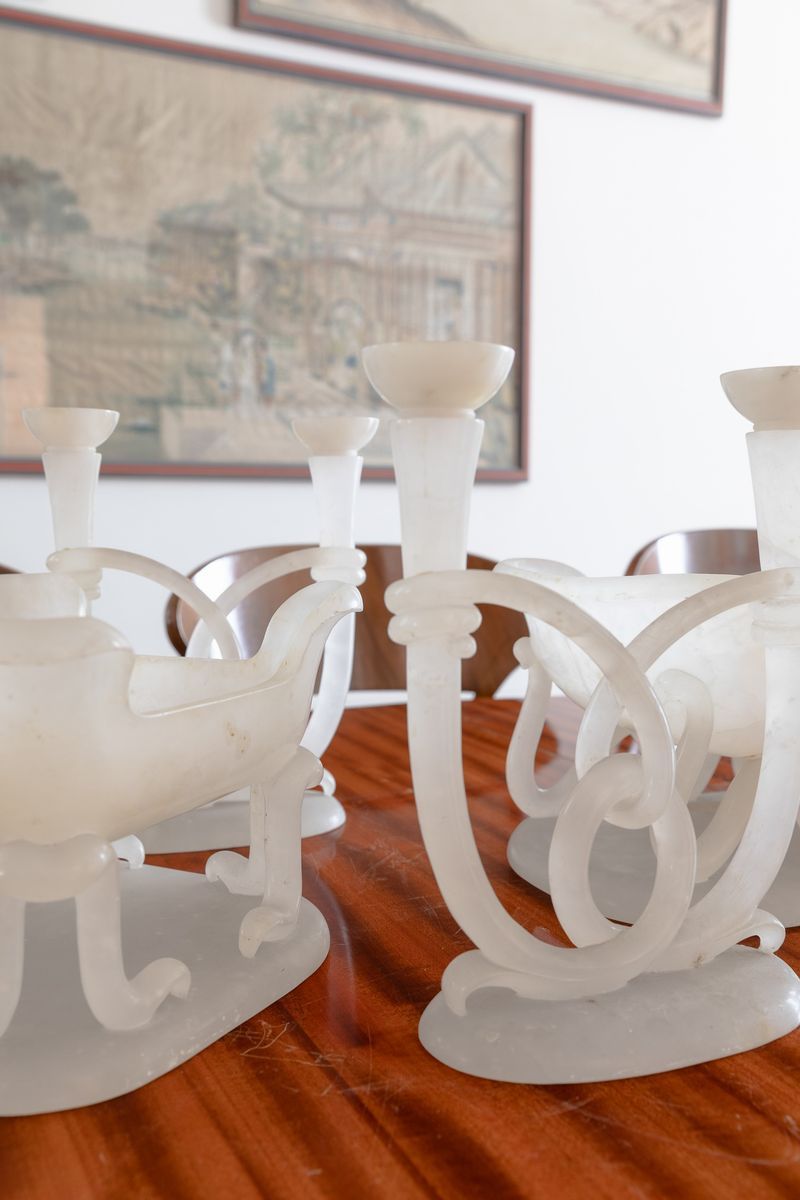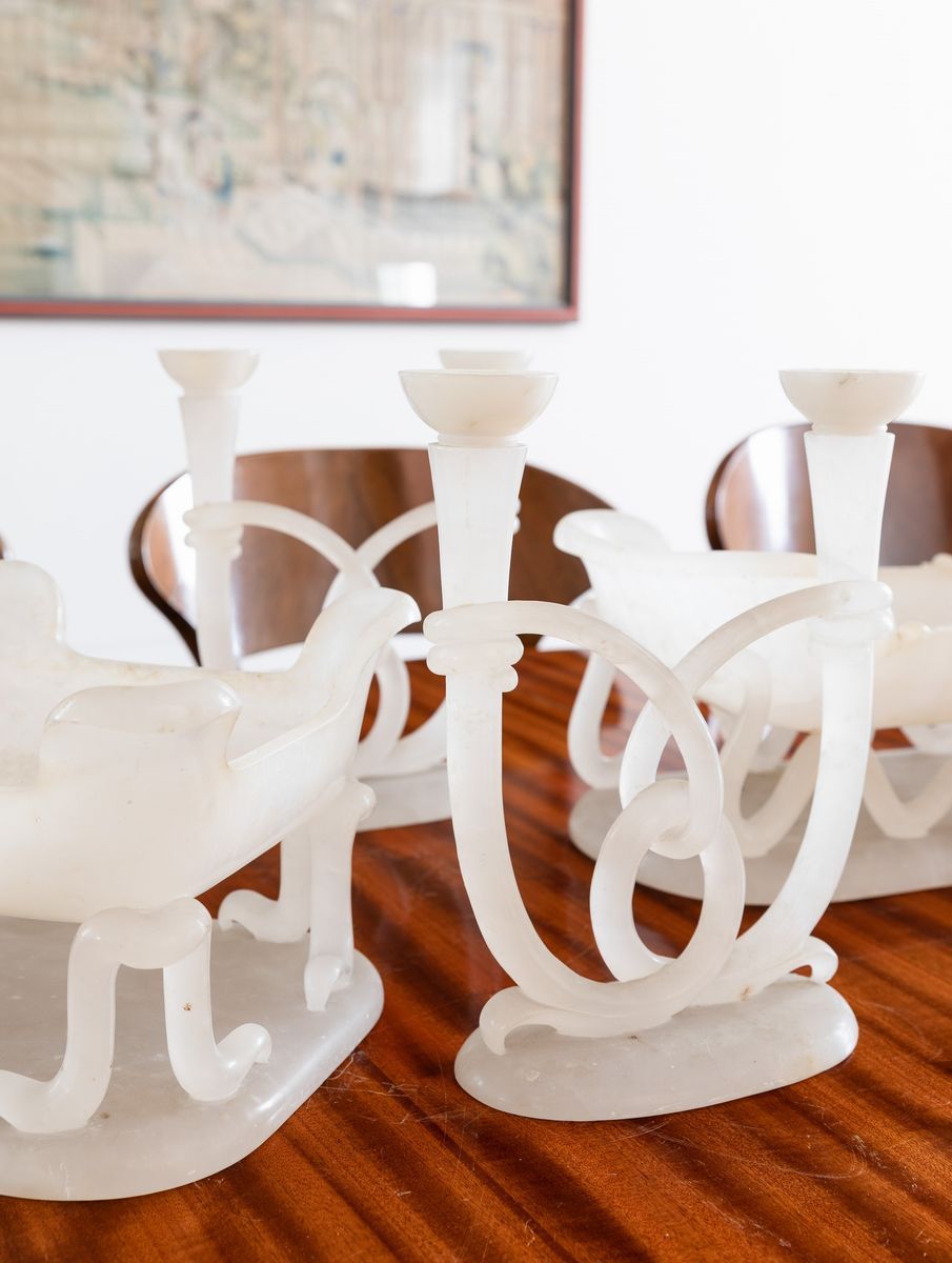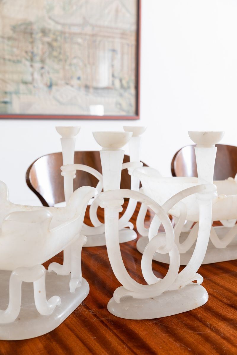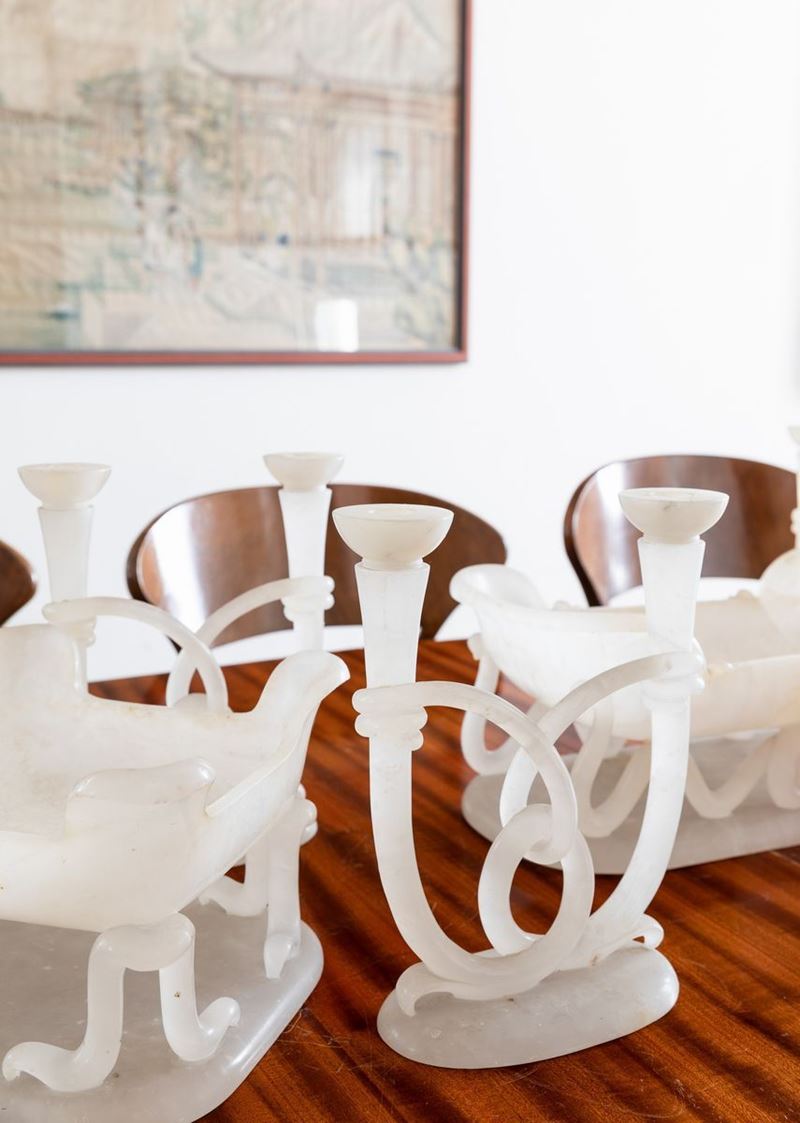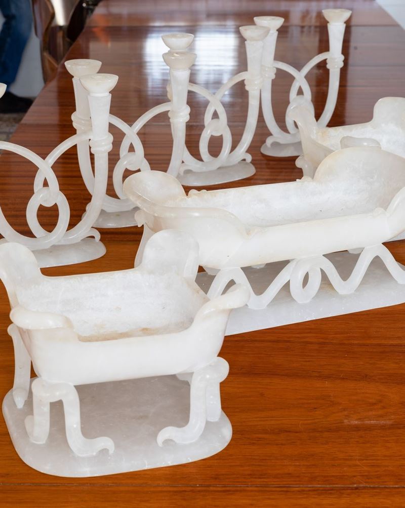Centrotavola in alabastro, composto da sette elementi: una grande vasca centrale rettangolare, due fioriere quadrate su basamenti a motivi di serpenti intrecciati e quattro doppieri.