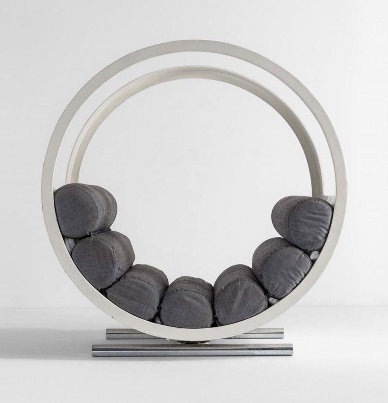 Poltrona a dondolo con struttura in ABS e rivestimenti in tessuto.