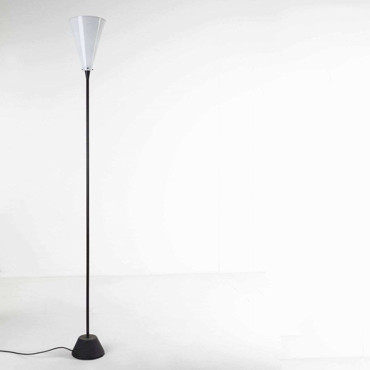 Lampada da terra mod. 1051/PX con struttura ottone laccato, diffusore in metacrilato opalino e base in ghisa laccata nero craquelè.