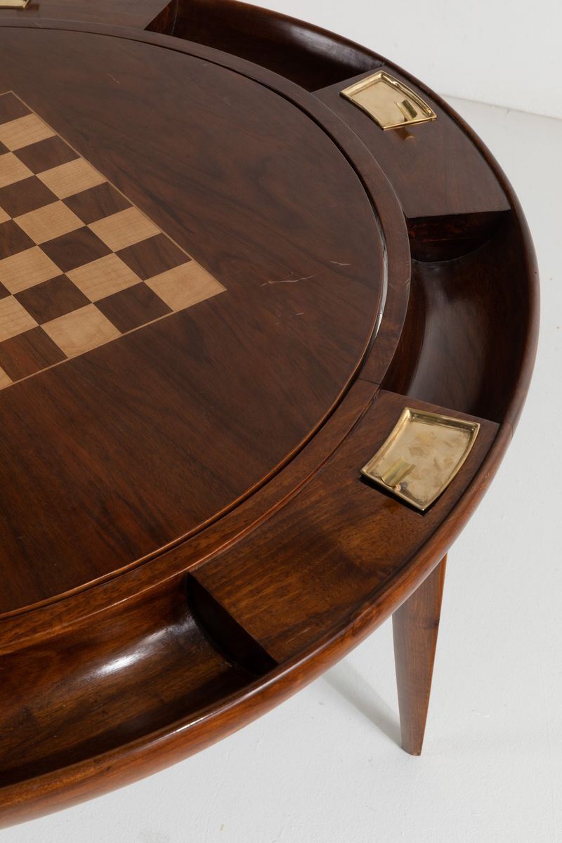 Tavolo da gioco con piano ribaltabile in legno con scacchiera intarsiata da un lato e rivestito in panno verde dall'altro.