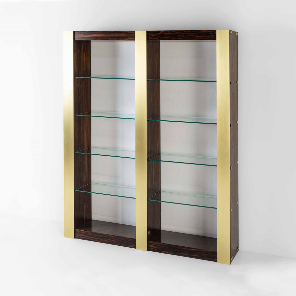 Libreria mod. Unicum a due campate e finitura a giorno. Strutture in legno, piani in cristallo ed elementi in ottone.