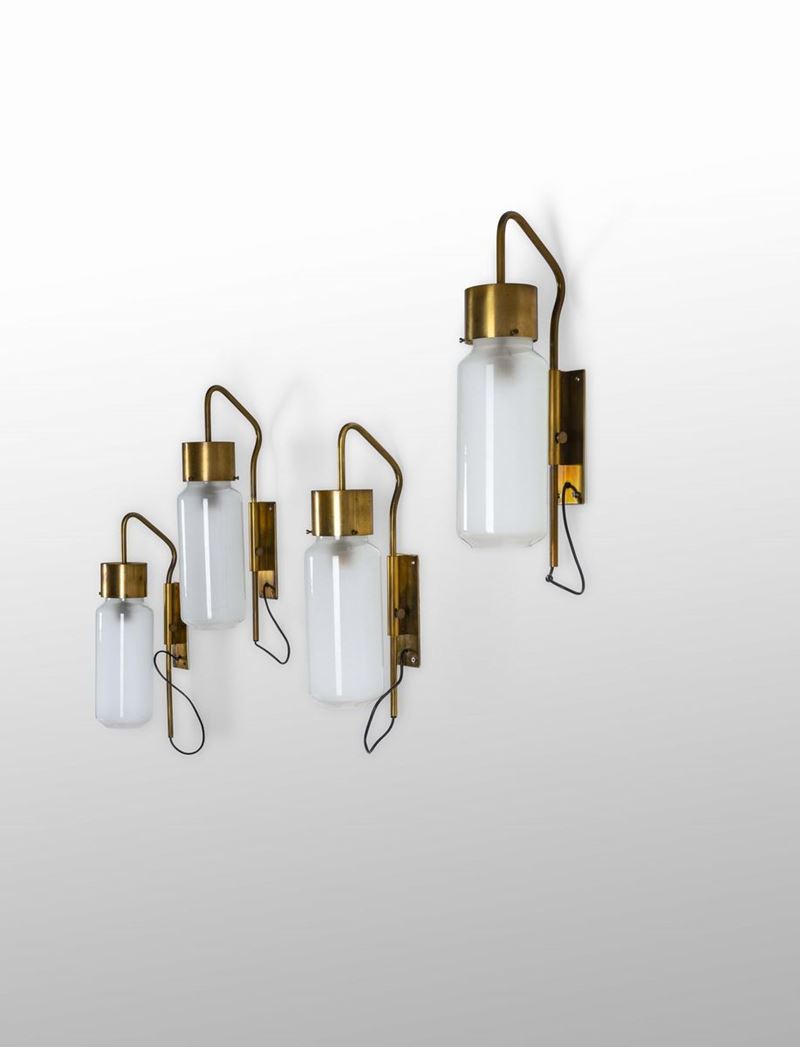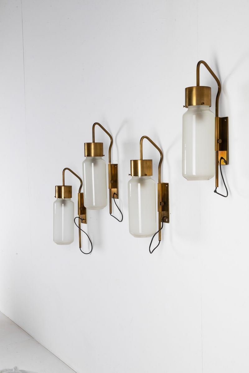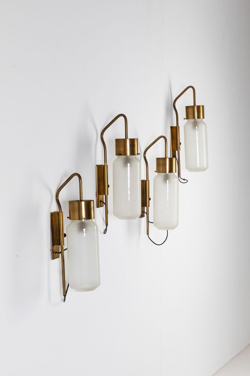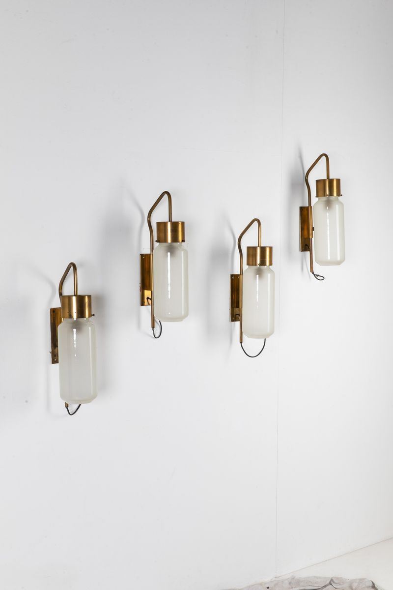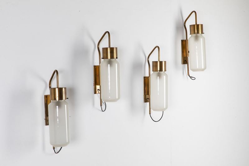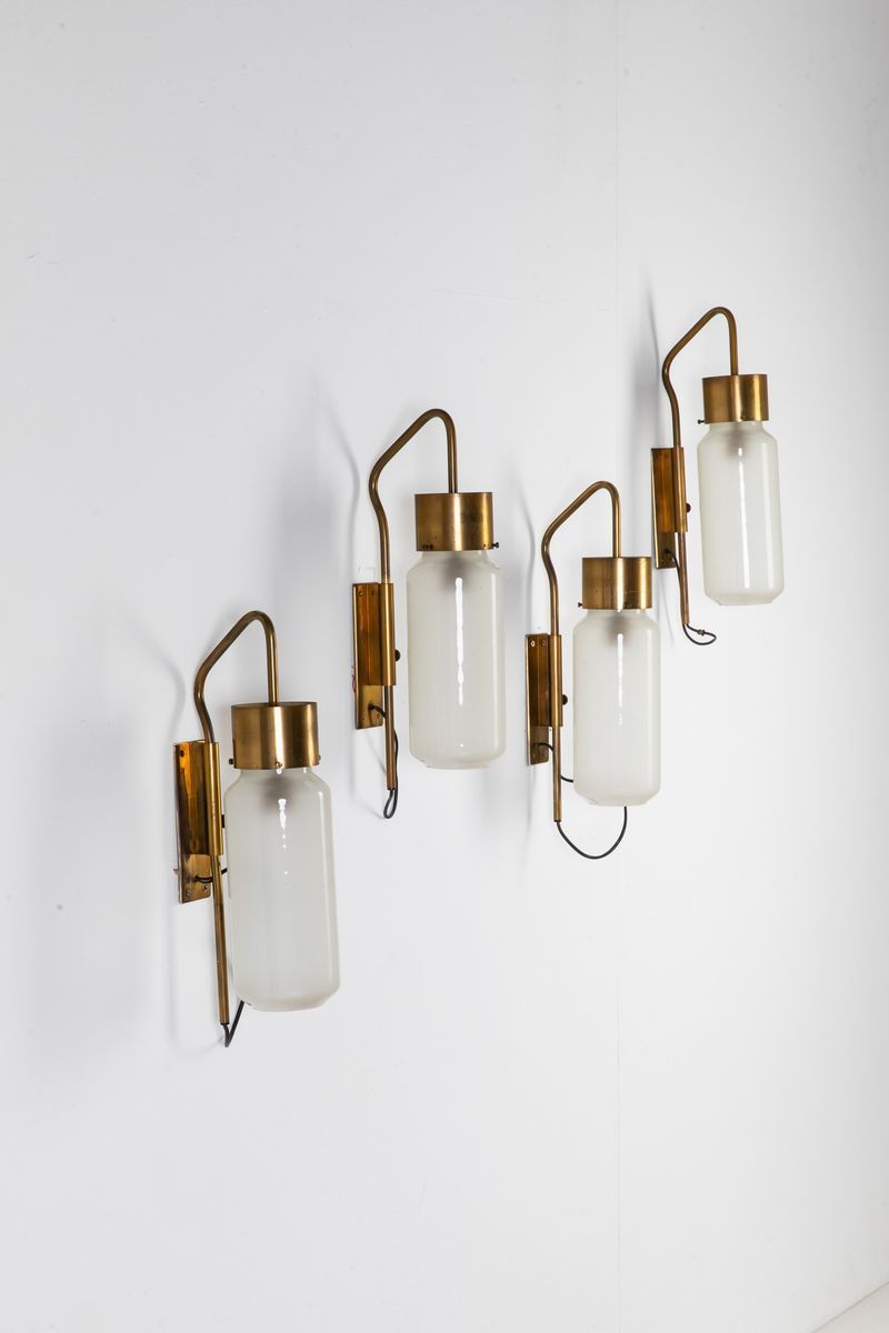 Quattro lampade da parete orientabili mod. LP10 in ottone e vetro satinato bianco.