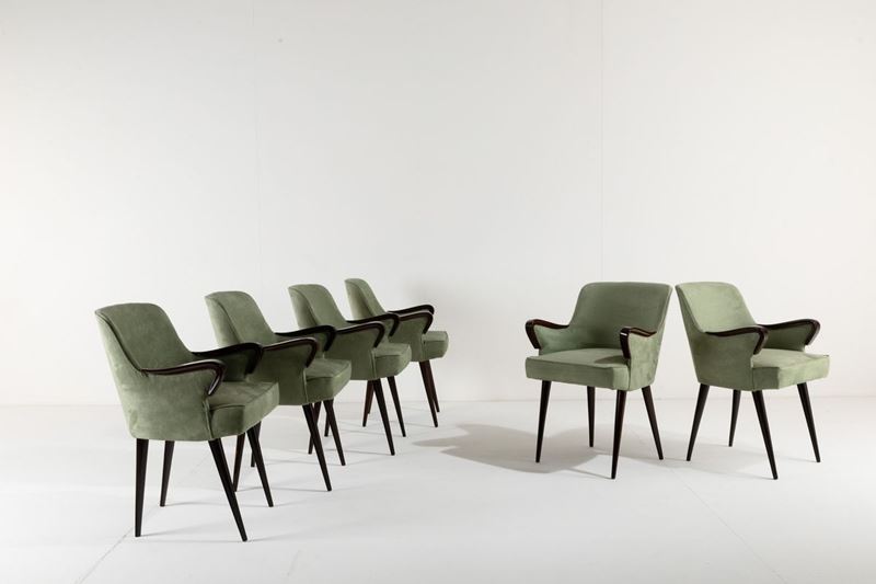 Sei poltroncine mod. P35 con struttura, braccioli e sostegni in legno e rivestimento in velluto.