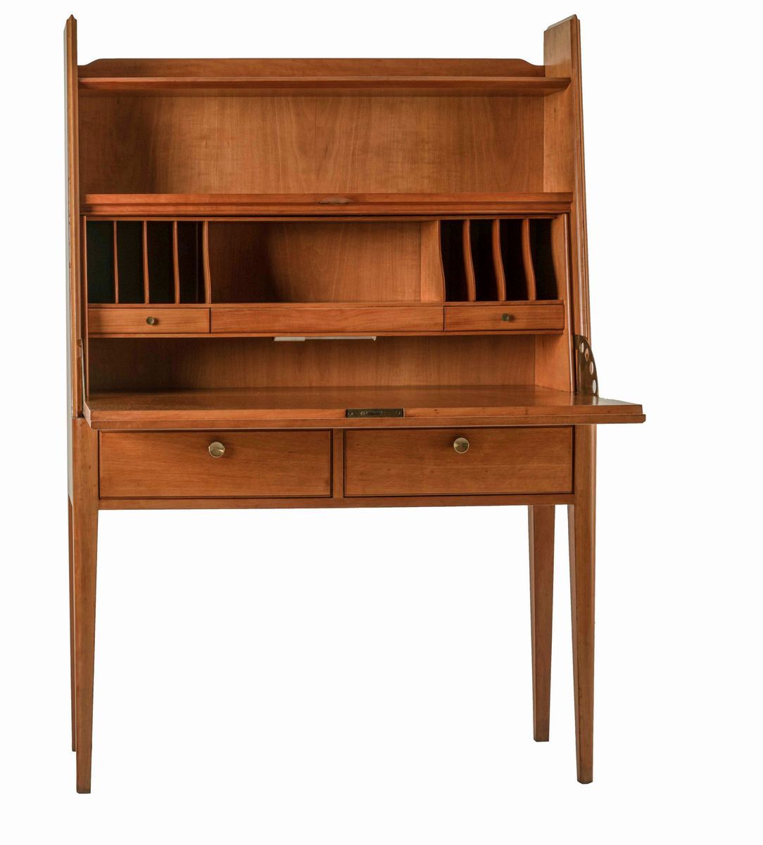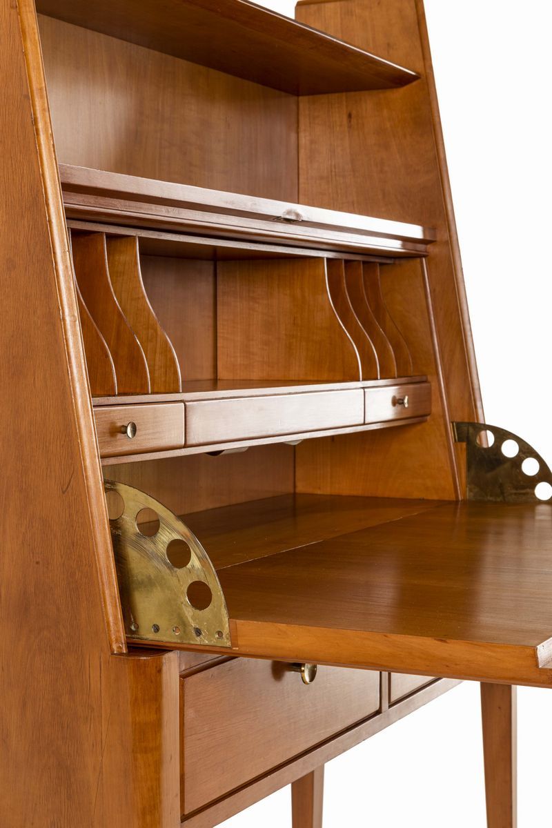 Mobile contenitore, piano a ribalta ad uso scrittoio, cassetti con struttura in legno e dettagli in ottone.
