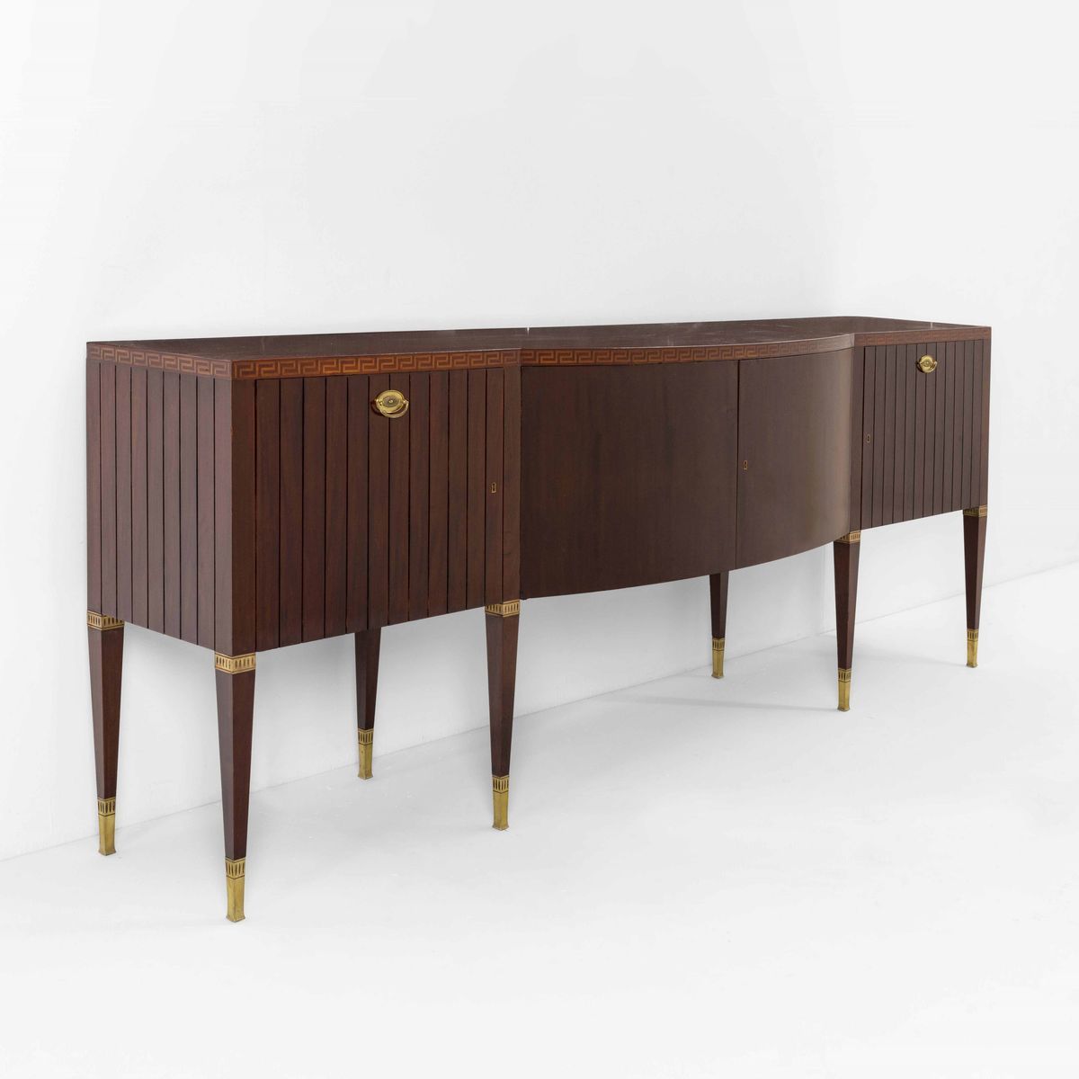 Mobile contenitore con struttura e sostegni in legno, piano in legno e profilo in legno intarsiato, particolari in ottone.