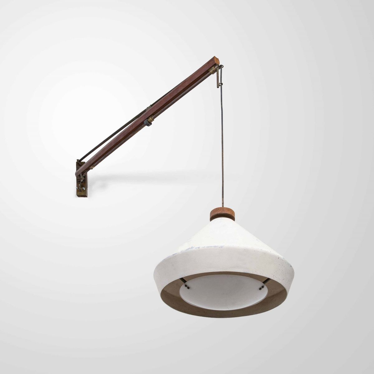 Lampada da parete regolabile e orientabile mod. 177A con struttura in legno, diffusore in alluminio laccato con lenticolare in perspex opalino. Dettagli in ottone.