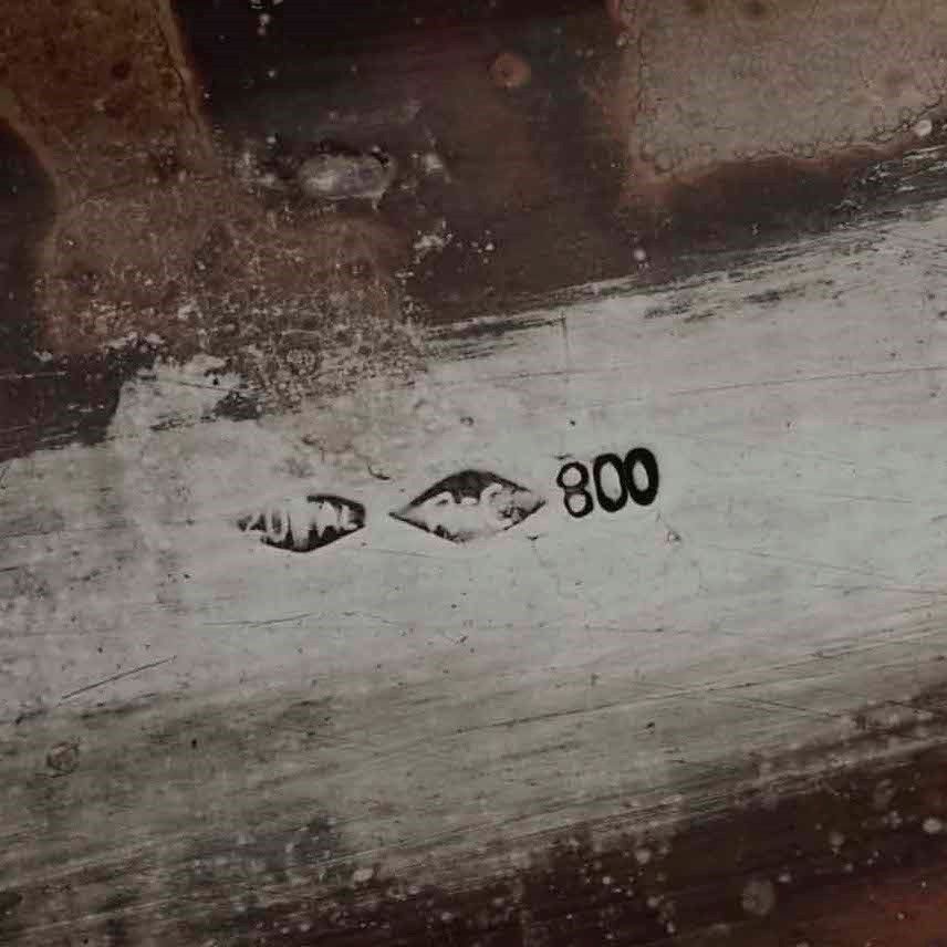 Centrotavola ovale in argento. Argenteria artistica italiana del XX secolo. Marchio di titolo con fascio littorio in uso dal 1935 al 1945. Argentiere Ricci & C. Alessandria