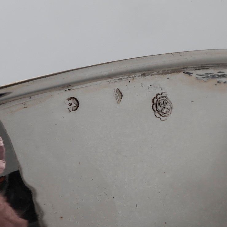 Coppetta e piattino in argento fuso e cesellato con talleri austriaci incastonati. Argenteria europea del XX secolo
