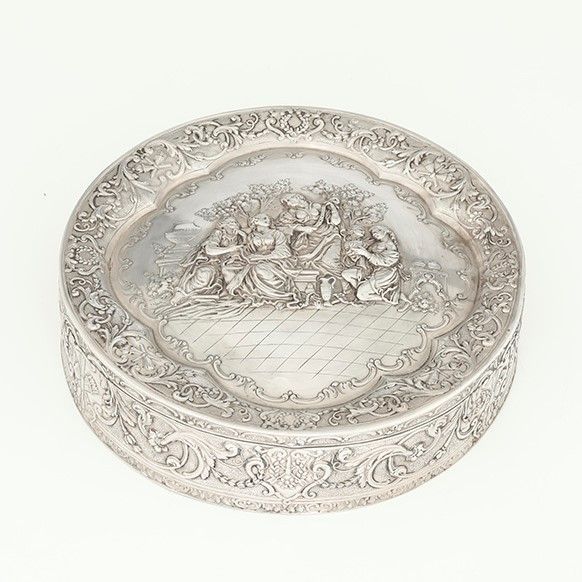 Scatola di forma circolare in argento fuso, sbalzato e cesellato. Argenteria artistica italiana del XX secolo