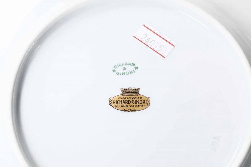 Porcellana. Marca: "Richard Ginori" in verde; "Magazzini Richard-Ginori Milano, Via Dante" in cartiglio oro con corona.