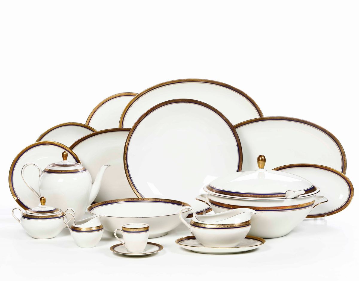 Il servizio per 12 persona conta 80 pezzi ed è così composto: 12 piatti fondi; 34 piatti piani; 12 piatti da dessert; 1 zuppiera con mestolo; 1 salsiera; 2 insalatiere; 2 piatti da portata rotondi; 3 piatti da portata ovali di diverse misure; 2 vassoietti; 1 caffettiera; 1 zuccheriera; 1 lattiera; 10 tazze da caffè con 12 piattini (di cui 1 sbeccato al bordo)